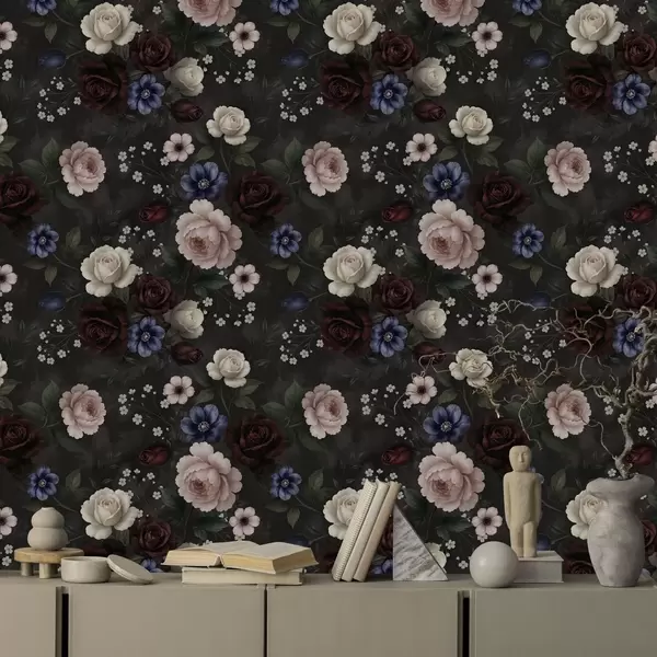 Papel pintado Rosas oscuras, anémonas y peonías sobre un fondo intenso Nr. a00704