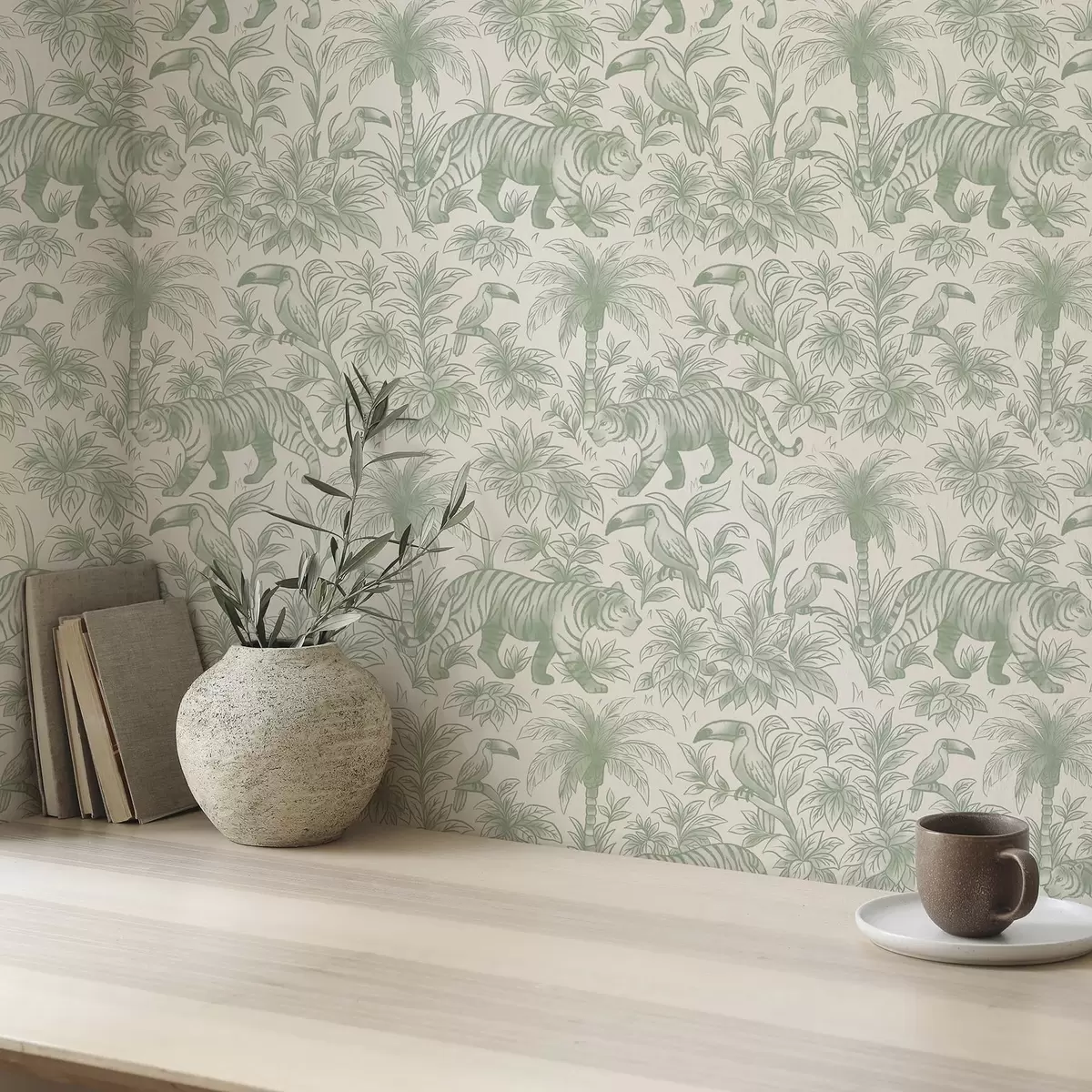 Papel pintado Tigres y aves tropicales entre palmeras sobre un fondo claro Nr. a00711