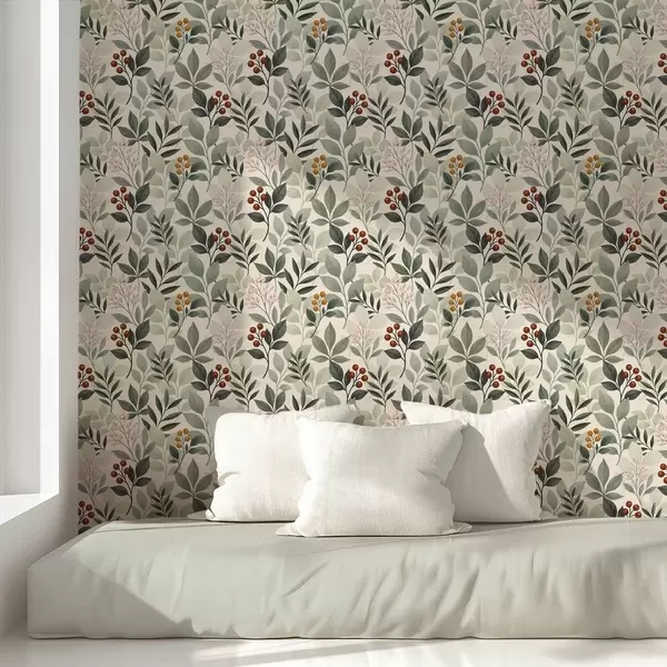 Papel pintado Hojas con bayas, fondo claro Nr. a00713