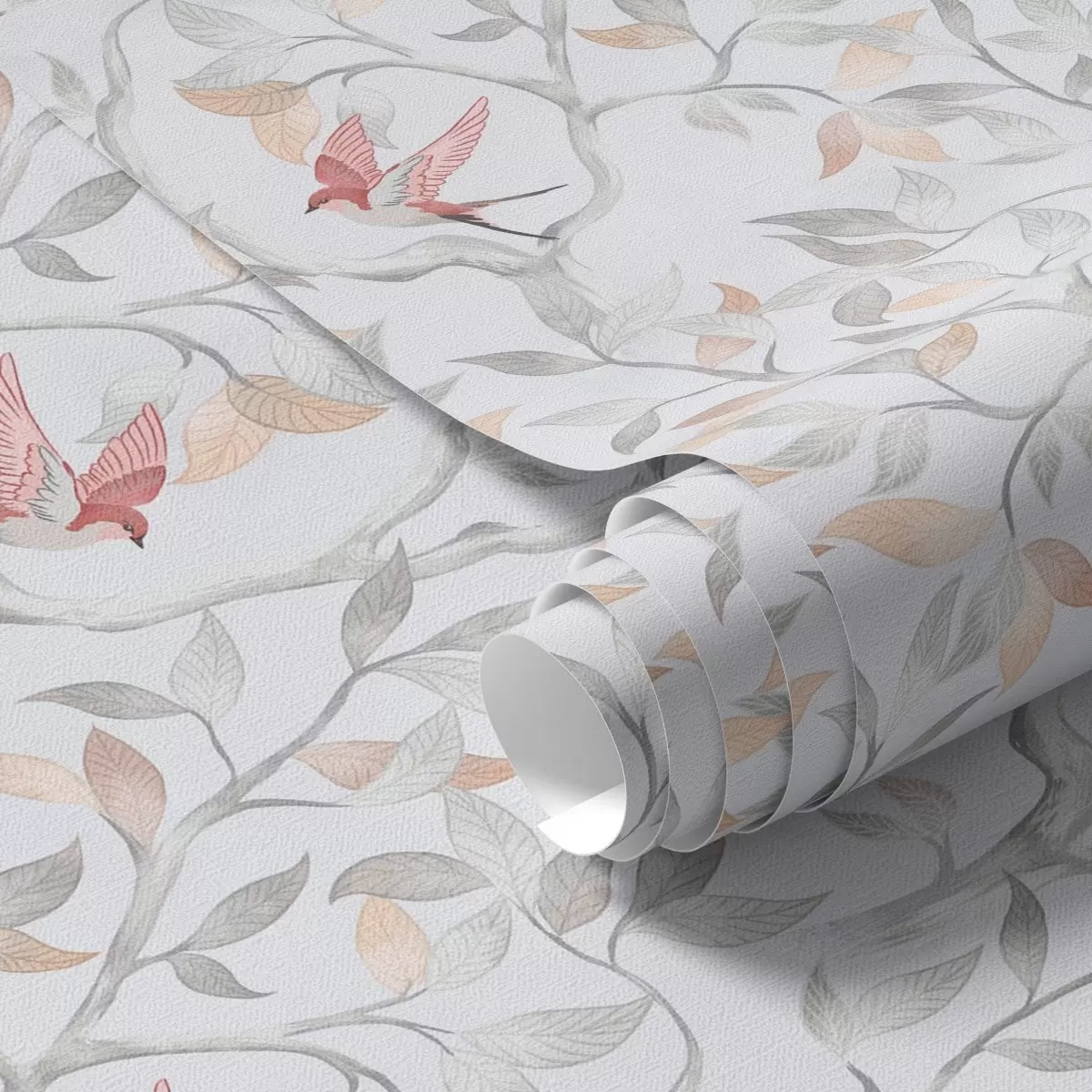Papel pintado Ramas ligeras con hojas y pájaros en tonos melocotón Nr. a00716