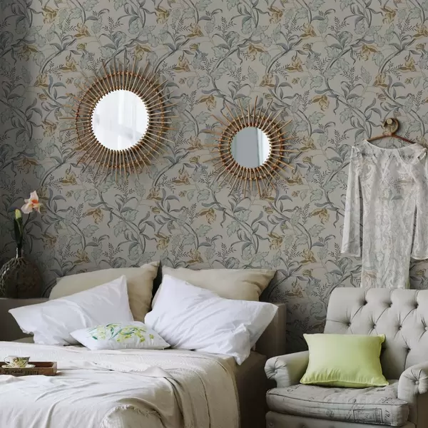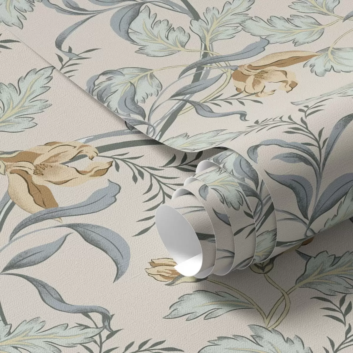 Papel pintado Flores vintage con follaje azul sobre fondo crema Nr. a00717