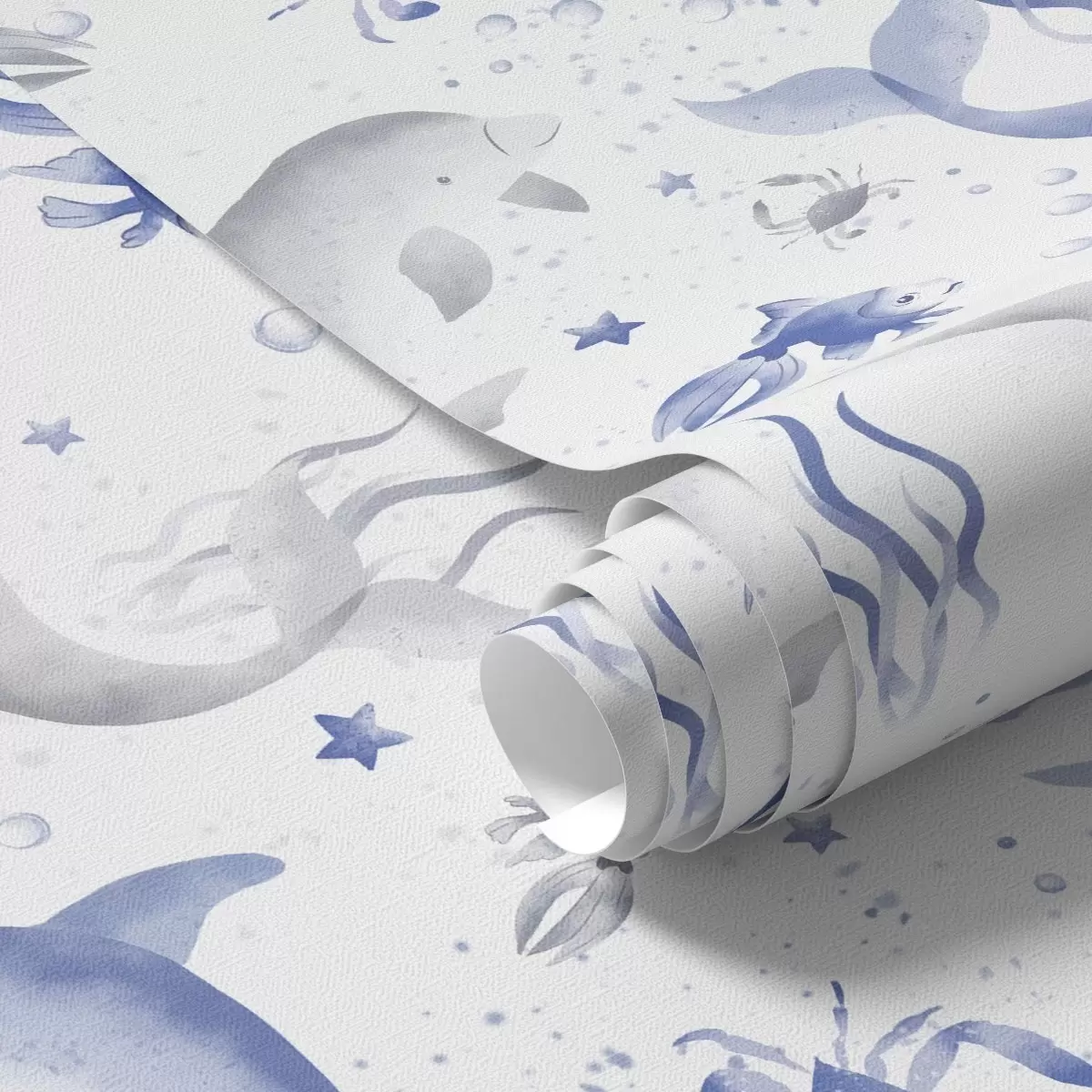 Papel pintado Ballenas marinas y delfines en tonos azules sobre fondo blanco Nr. a00720v1