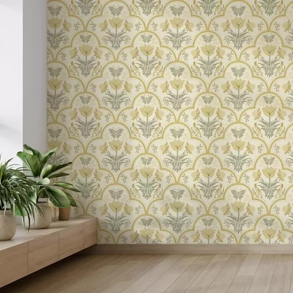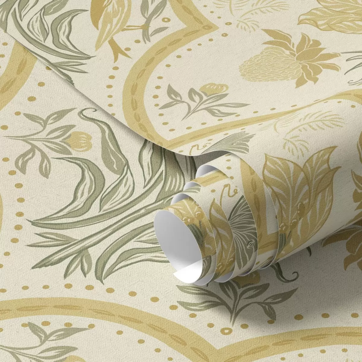 Papel pintado Adorno con tulipán, pájaros y mariposas, ocre Nr. a00722