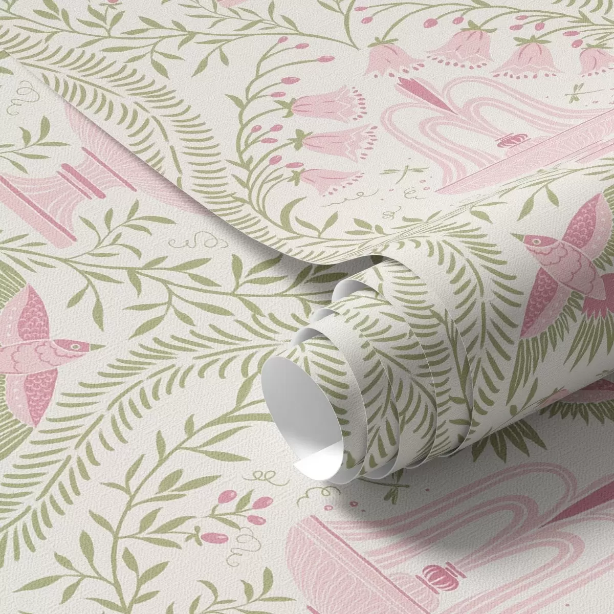 Papel pintado Fuentes, colibríes y volutas verdes sobre fondo claro Nr. a00723