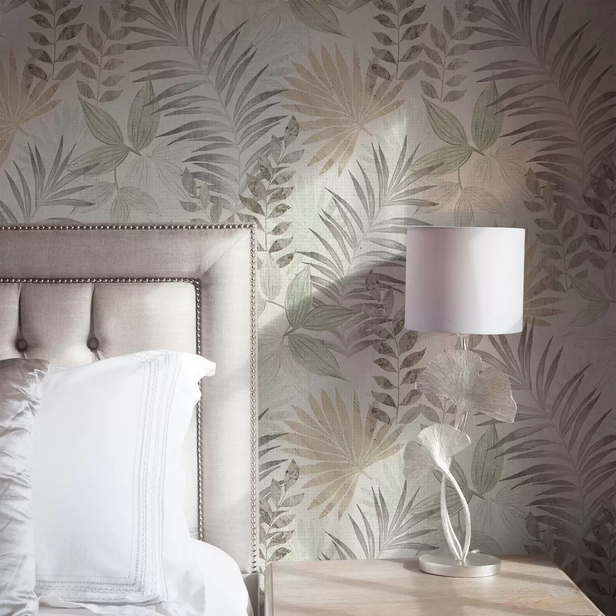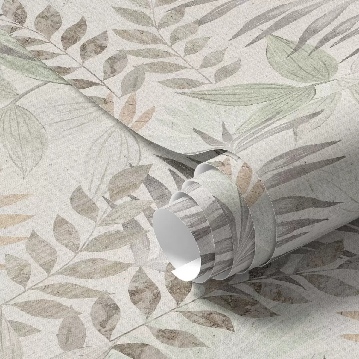 Papel pintado Hojas tropicales en tonos pastel sobre un fondo claro, textura sutil Nr. a00725