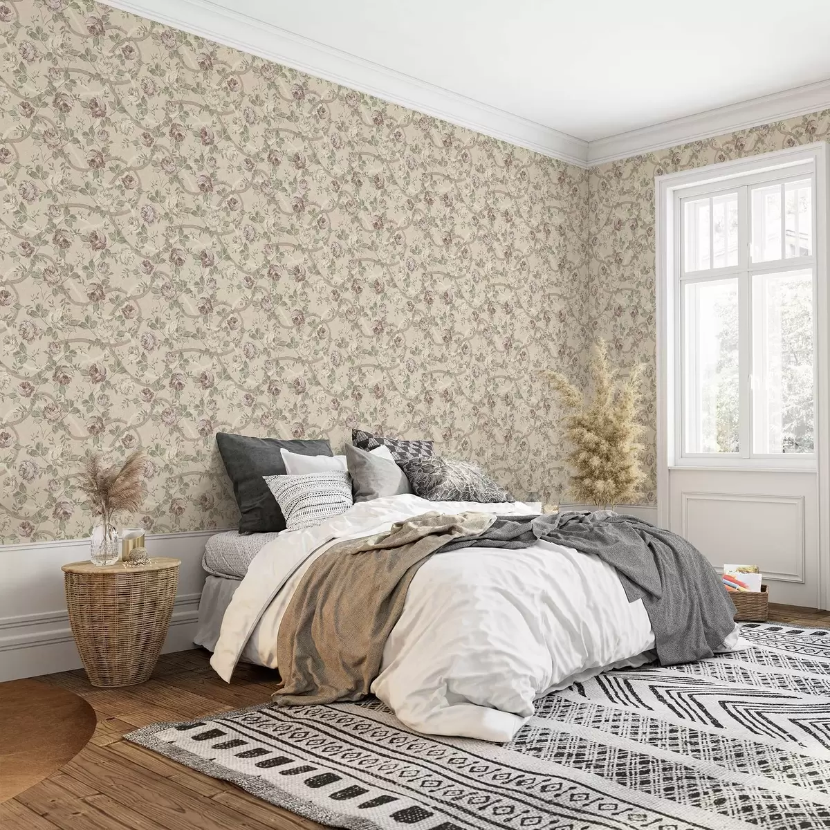 Papel pintado Rosas con hojas verdes sobre un fondo beige cálido Nr. a00729