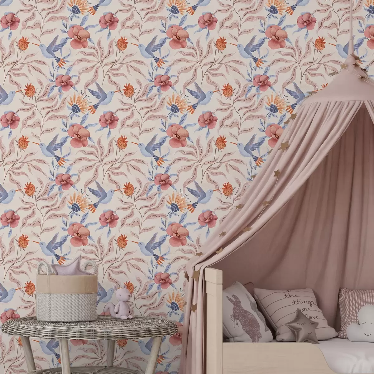 Papel pintado Colibríes entre grandes flores en tonos rosados y azules Nr. a00733