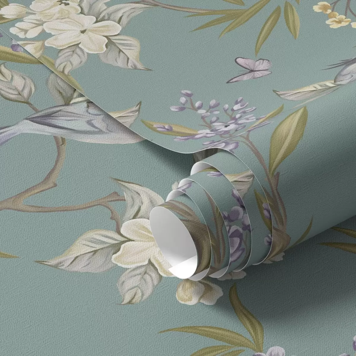 Papel pintado Pájaros, flores y mariposas sobre un fondo azul grisáceo. Nr. a00735