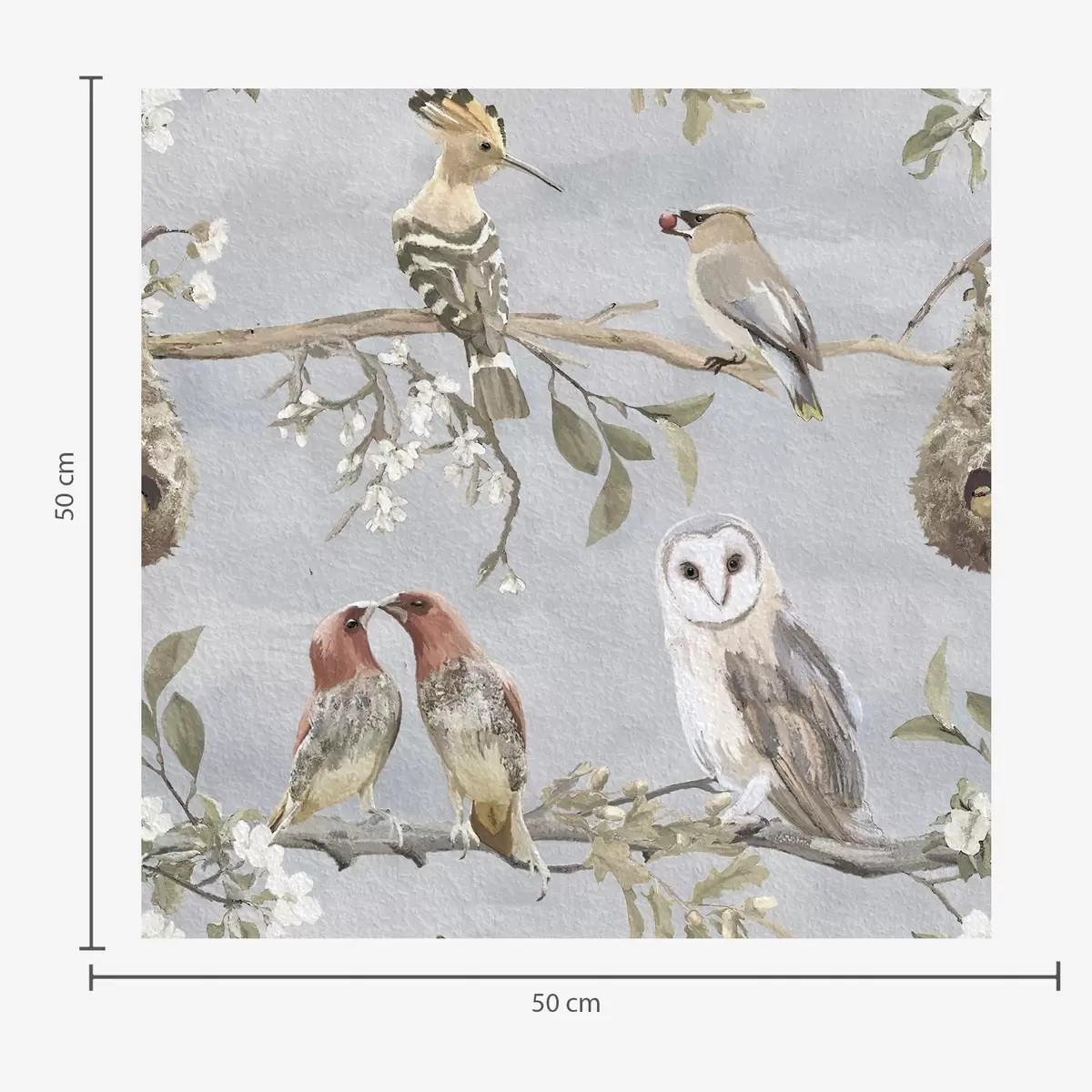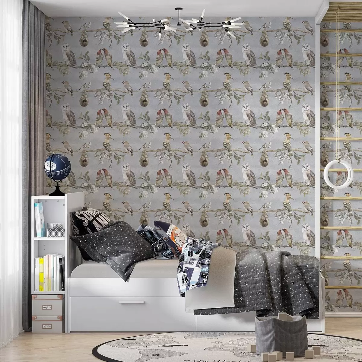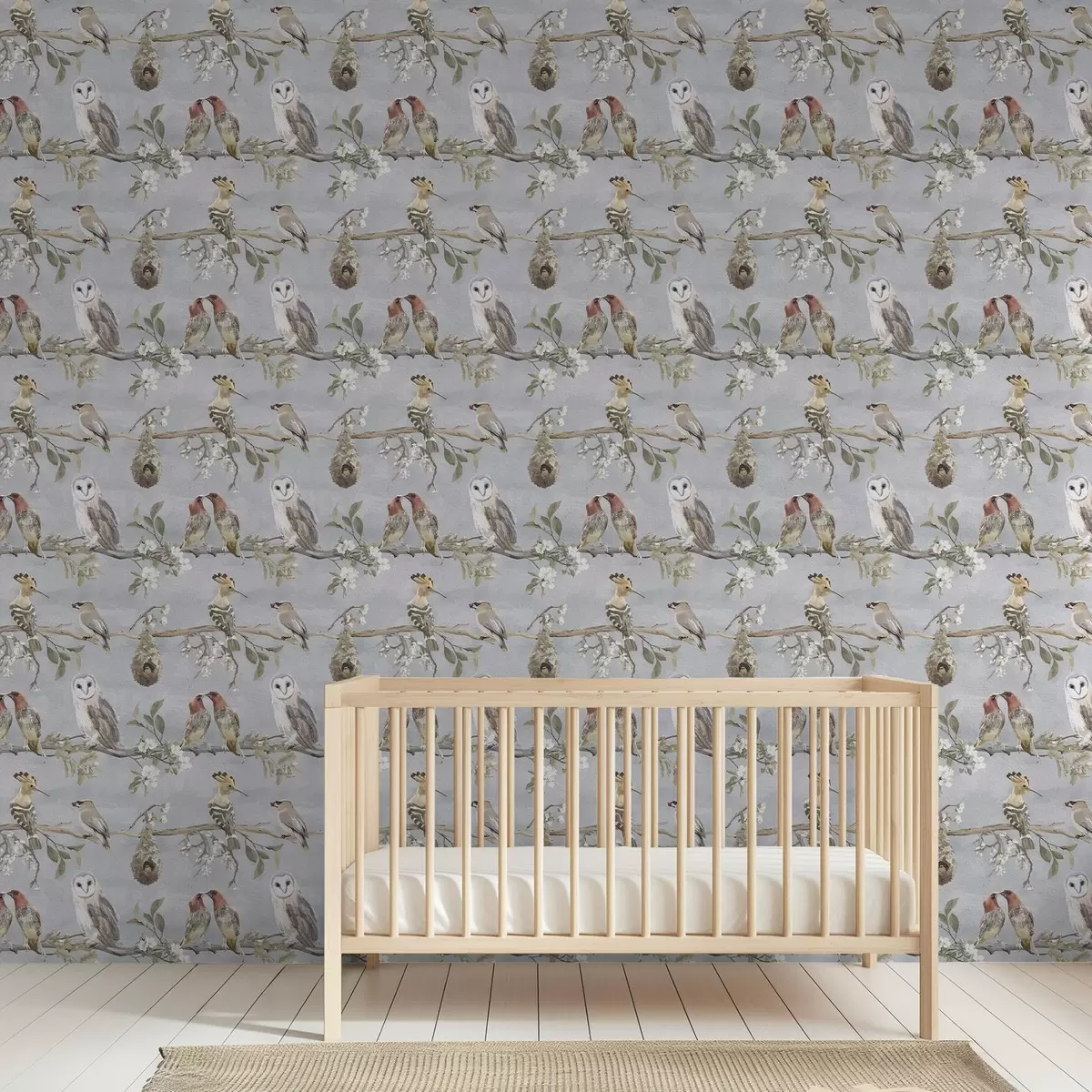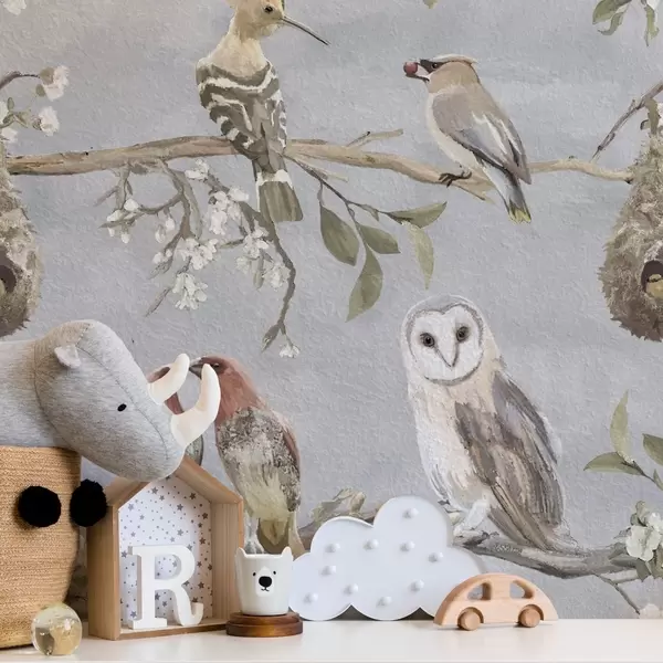 Papel pintado Pájaros en ramas con flores sobre fondo gris Nr. a00738