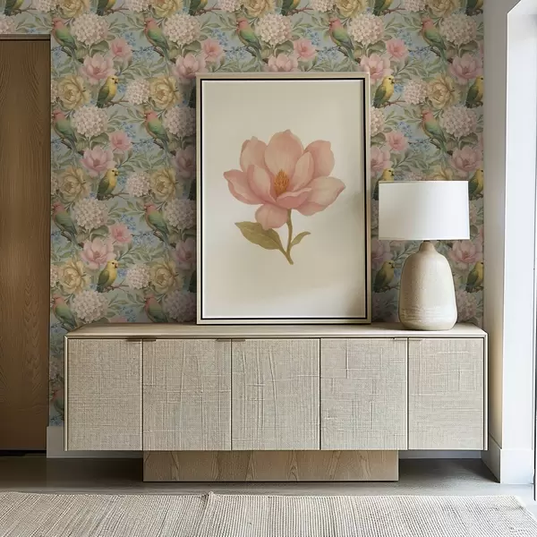 Papel pintado Loros entre peonías, hortensias y magnolias Nr. a00747