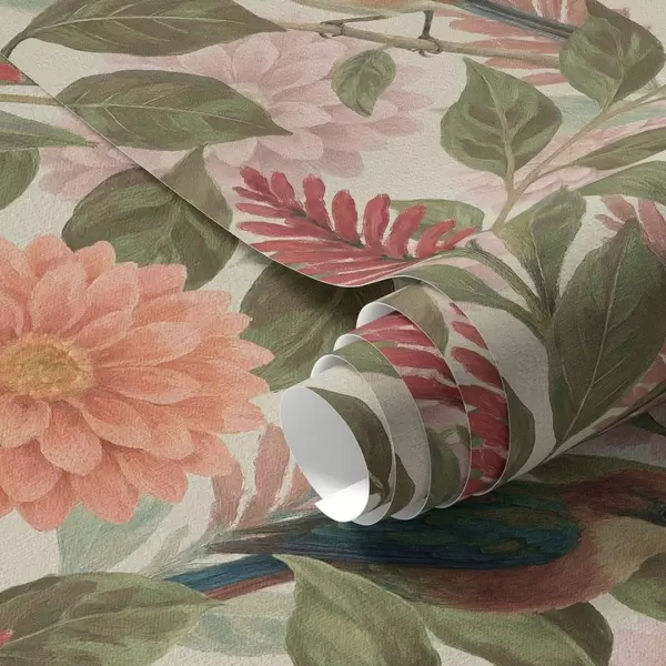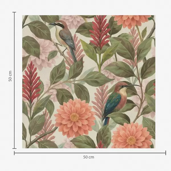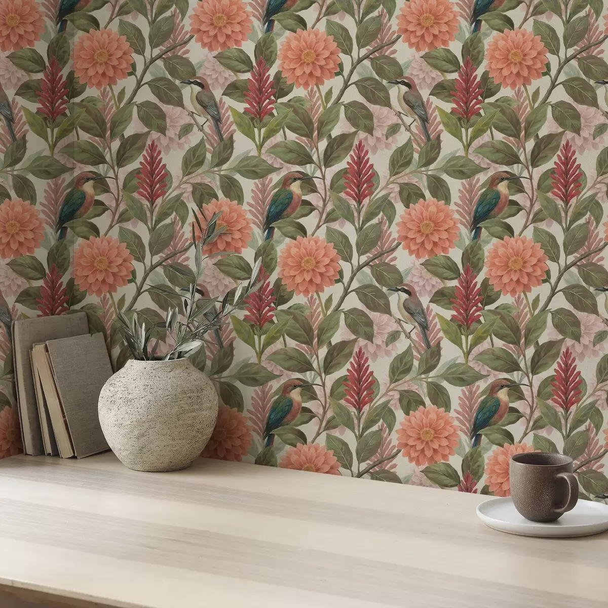 Papel pintado Pájaros entre flores y hojas en tonos cálidos Nr. a00753