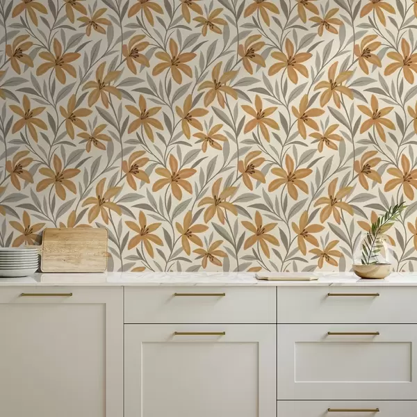 Papel pintado Lirios amarillos y hojas gris verdosas sobre fondo claro Nr. a00757