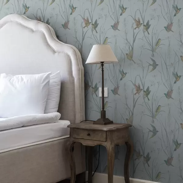 Papel pintado Pájaros entre la hierba del prado sobre un fondo gris azulado Nr. a00776