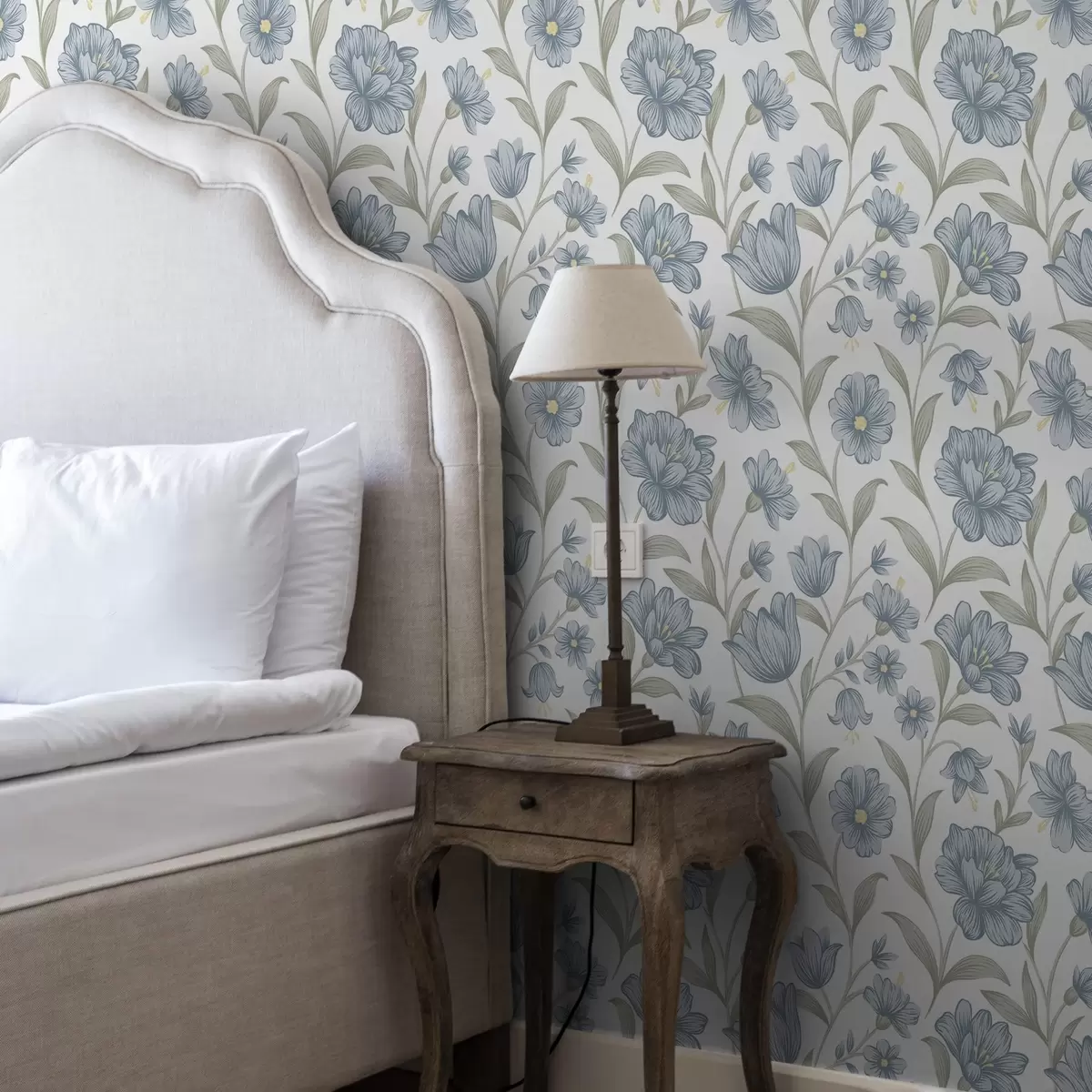 Papel pintado Flores azules polvorientas con hojas de olivo sobre fondo blanco Nr. a00780