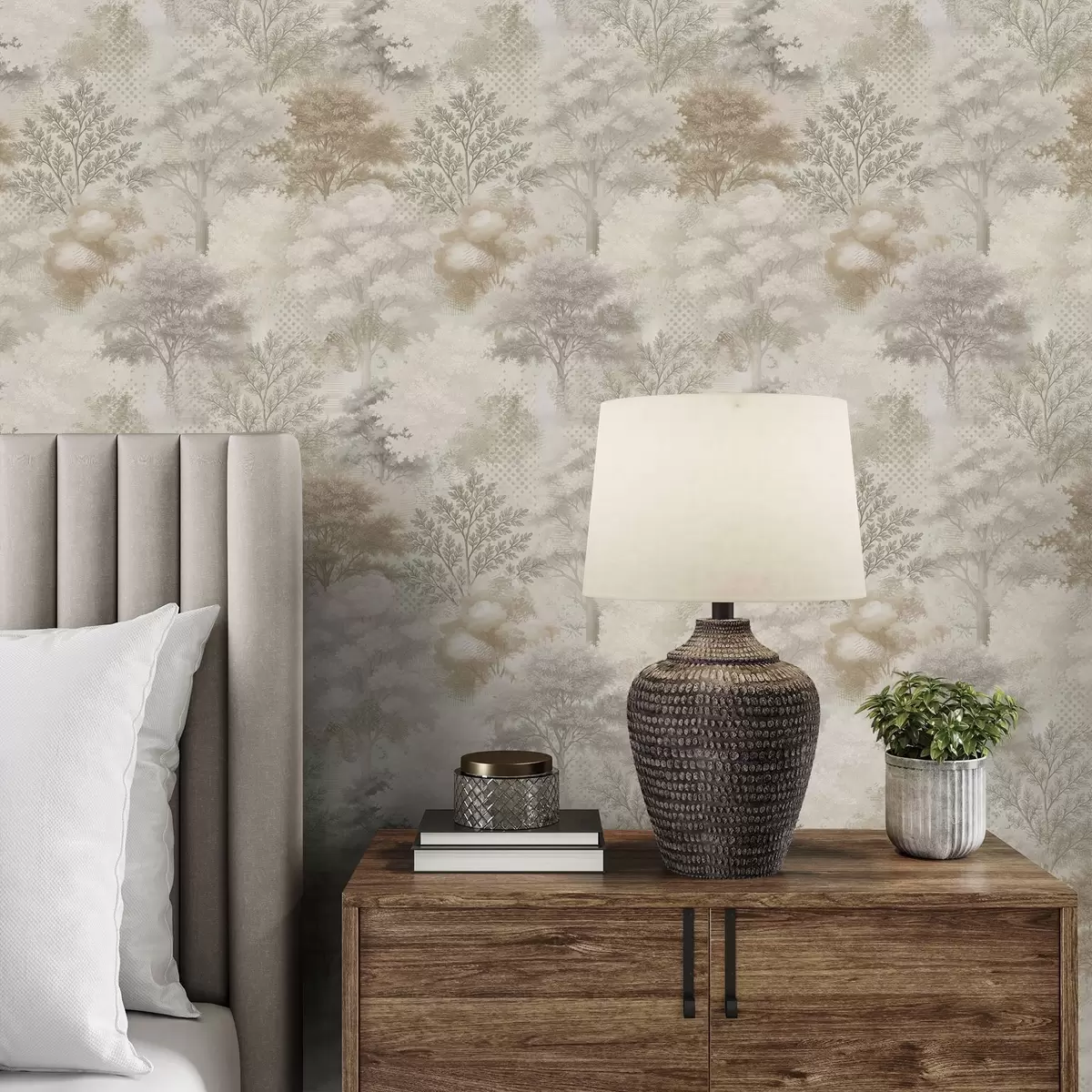 Papel pintado Bosque apacible envuelto en niebla, suaves tonos beige y grisáceos Nr. a00785
