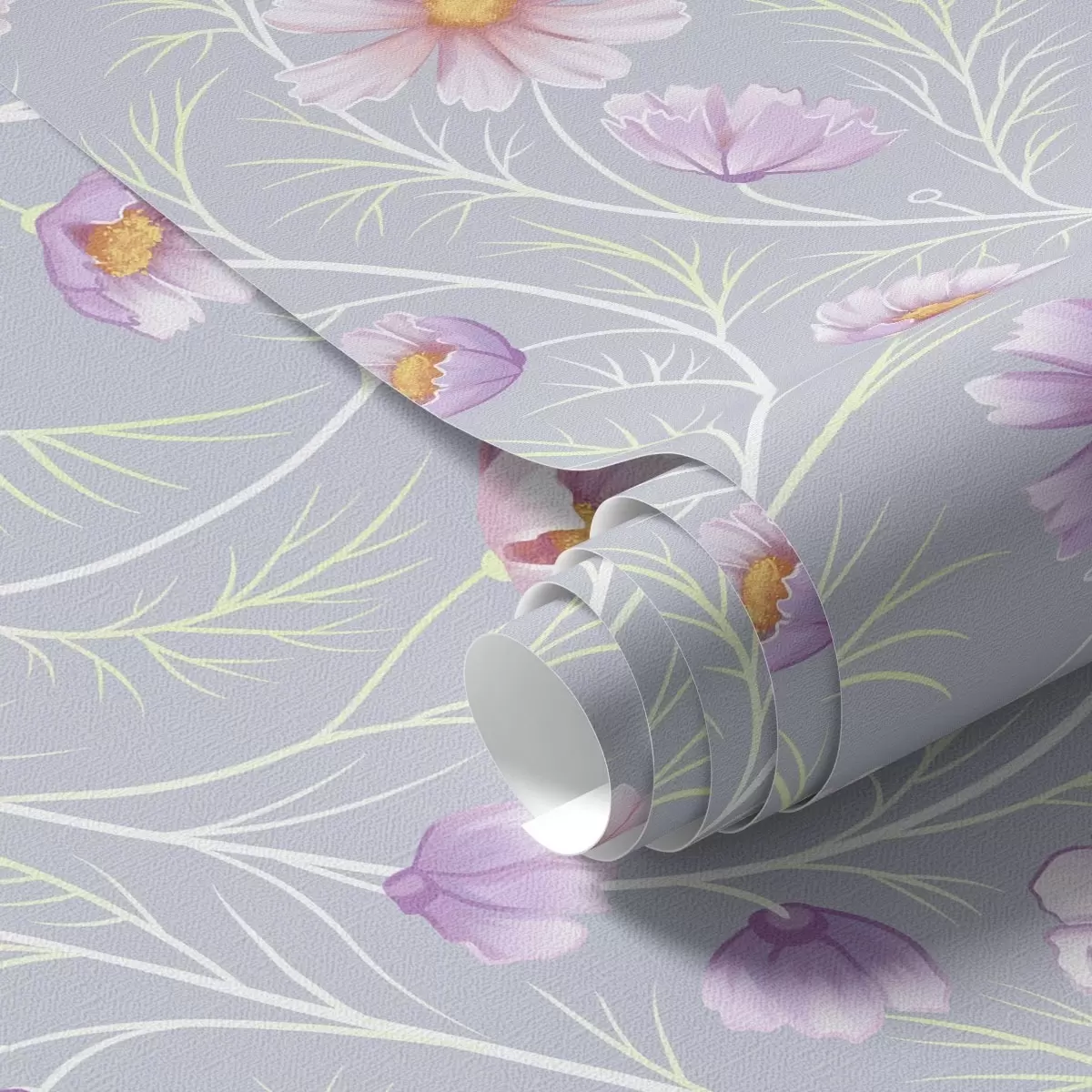Papel pintado Cosmos rosados y tallos delgados sobre fondo gris a00791