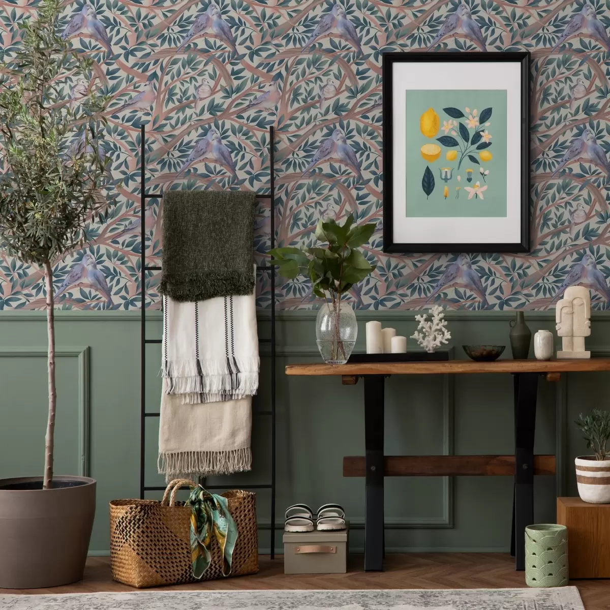 Papel pintado Palomas entre ramas y hojas en una suave paleta de colores pastel Nr. a00796
