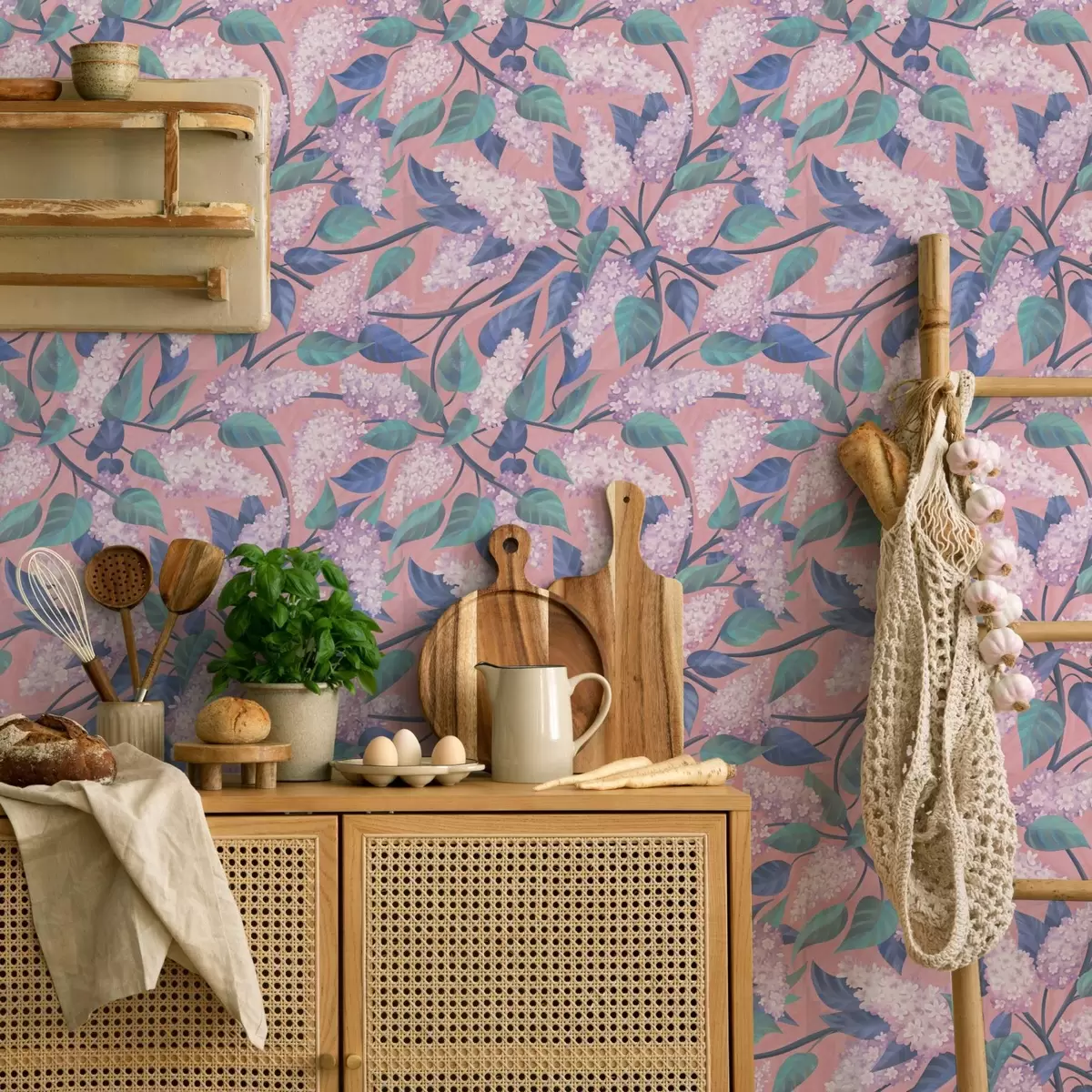 Papel pintado Delicadas flores lilas sobre fondo rosa, ambiente primaveral Nr. a00797