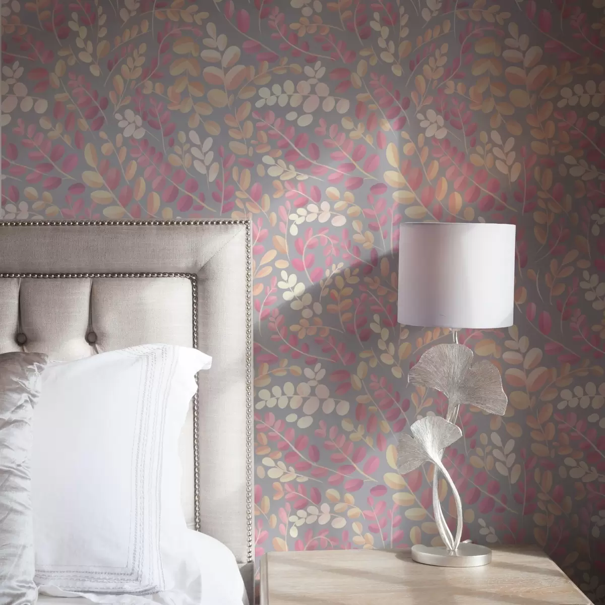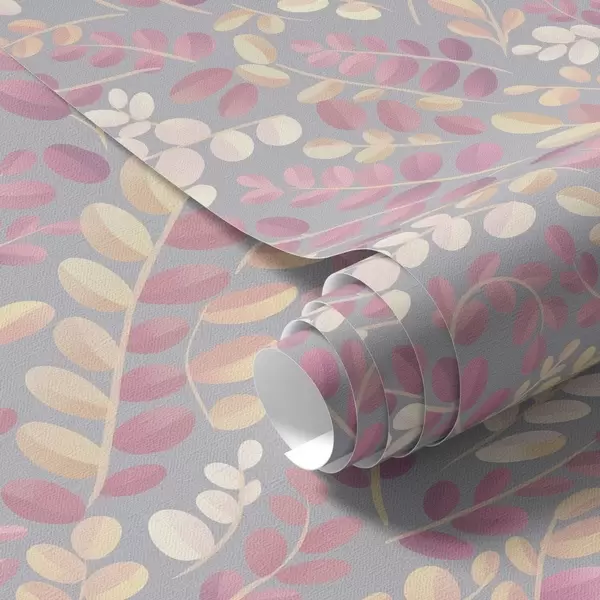 Papel pintado Ramitas en tonos pastel con follaje rosa-melocotón sobre fondo gris Nr. a00799v1