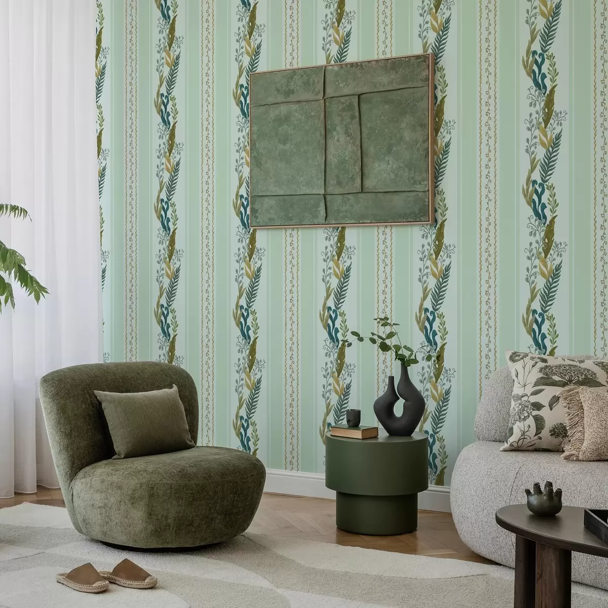Papel pintado Rayas anchas con ramas pictóricas sobre un suave fondo menta. Nr. a00825v1