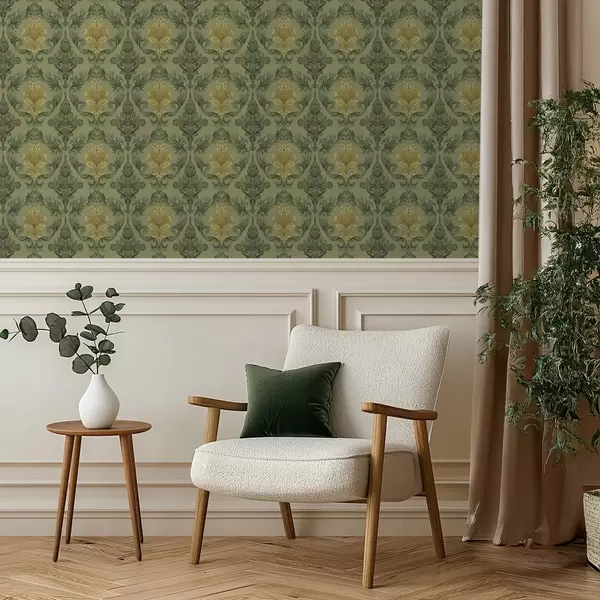 Papel pintado Damasco con volutas vegetales, paleta de colores oliva y ocre Nr. a00828