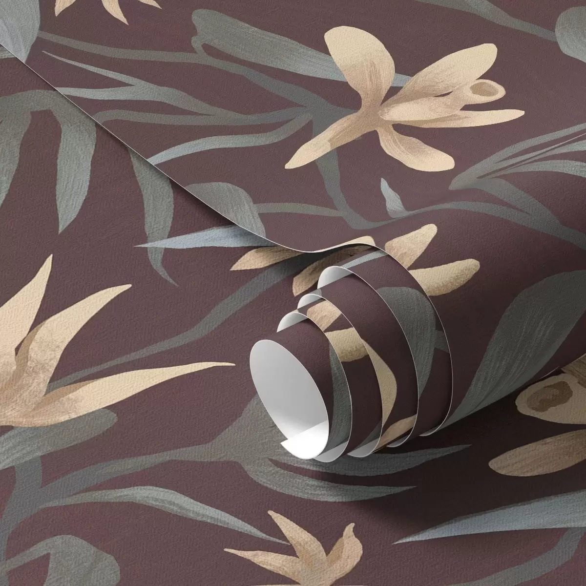 Papel pintado Flores color crema con hojas grises sobre fondo burdeos. Nr. a00833