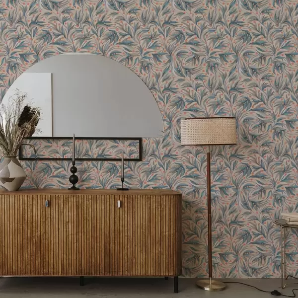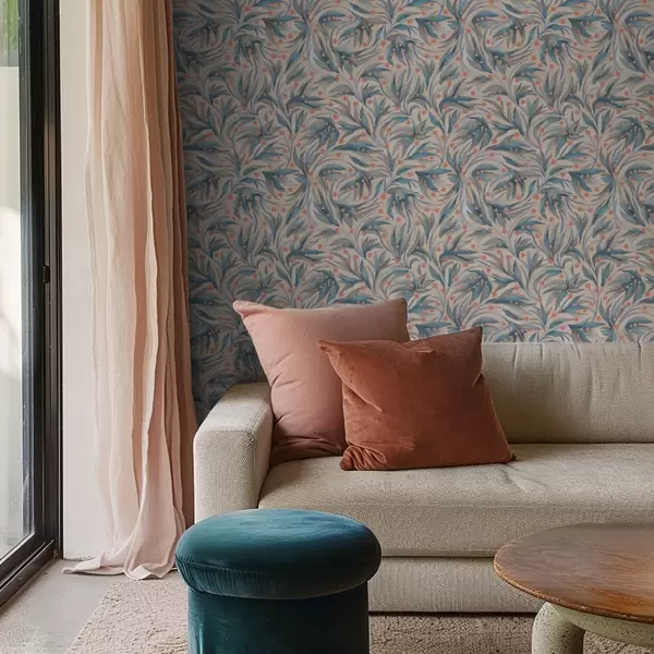 Papel pintado Follaje azul abstracto con flores coralinas Nr. a00852