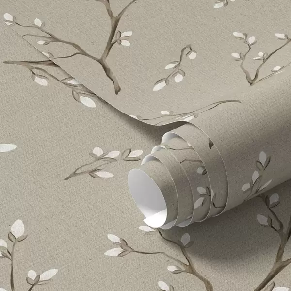 Papel pintado Ramitas con brotes blancos sobre fondo gris topo lino Nr. a00861