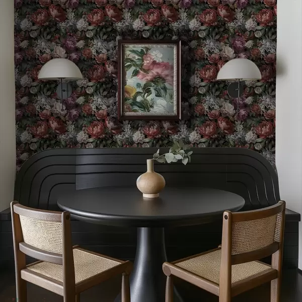 Papel pintado Peonías oscuras y dramáticas, bayas y mariposa sobre fondo negro. Nr. a00862