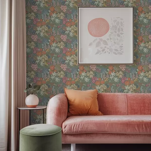 Papel pintado Flores campestres pintadas sobre fondo verde salvia Nr. a00864
