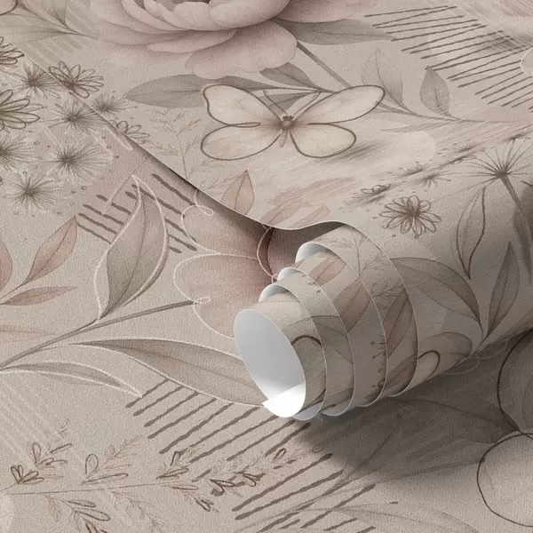 Papel pintado Estampado floral en tonos beige sepia con detalles lineales y mariposas. Nr. a00870