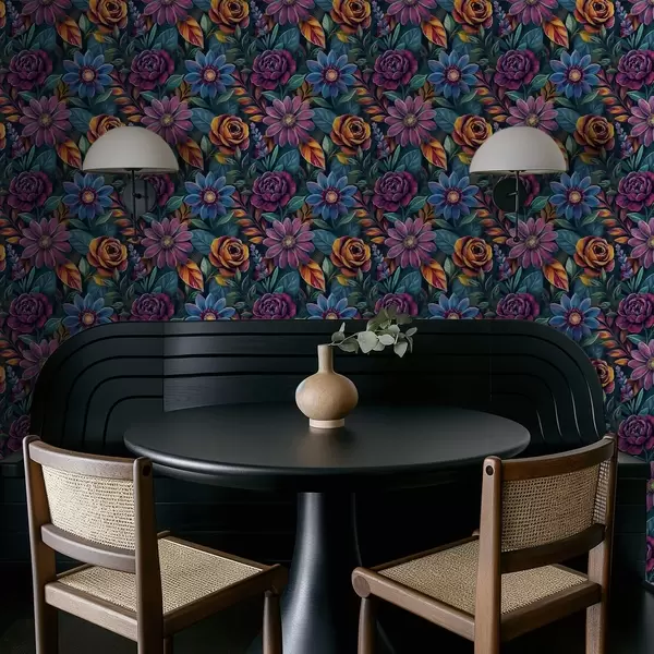 Papel pintado Vibrantes motivos florales en tonos joya sobre fondo azul marino intenso. Nr. a00871
