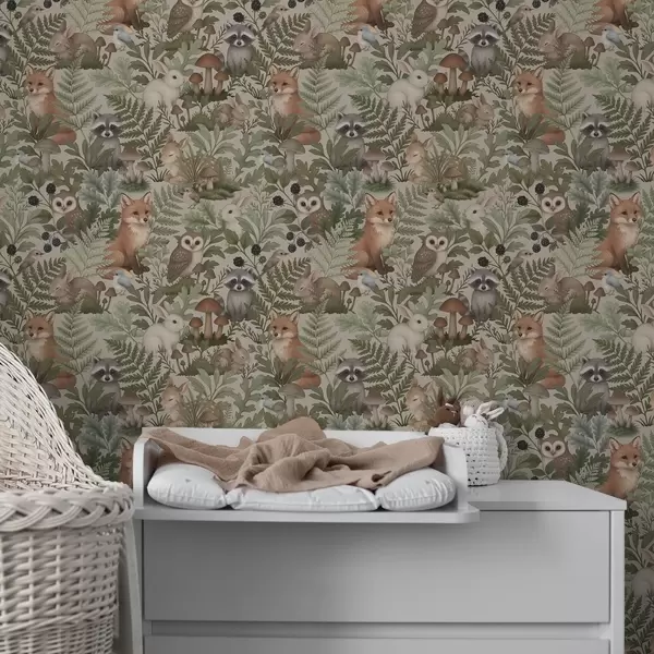 Papel pintado Animales del bosque, helechos y setas sobre fondo beige claro. Nr. a00880v1