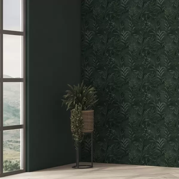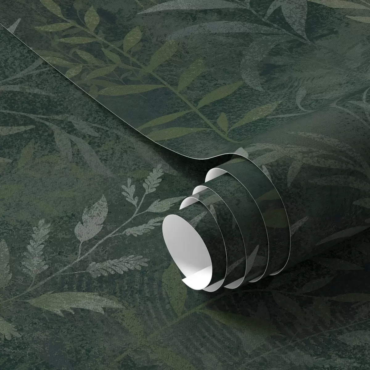 Papel pintado Fondo verde oscuro con ramas de hojas translúcidas. Nr. a00888