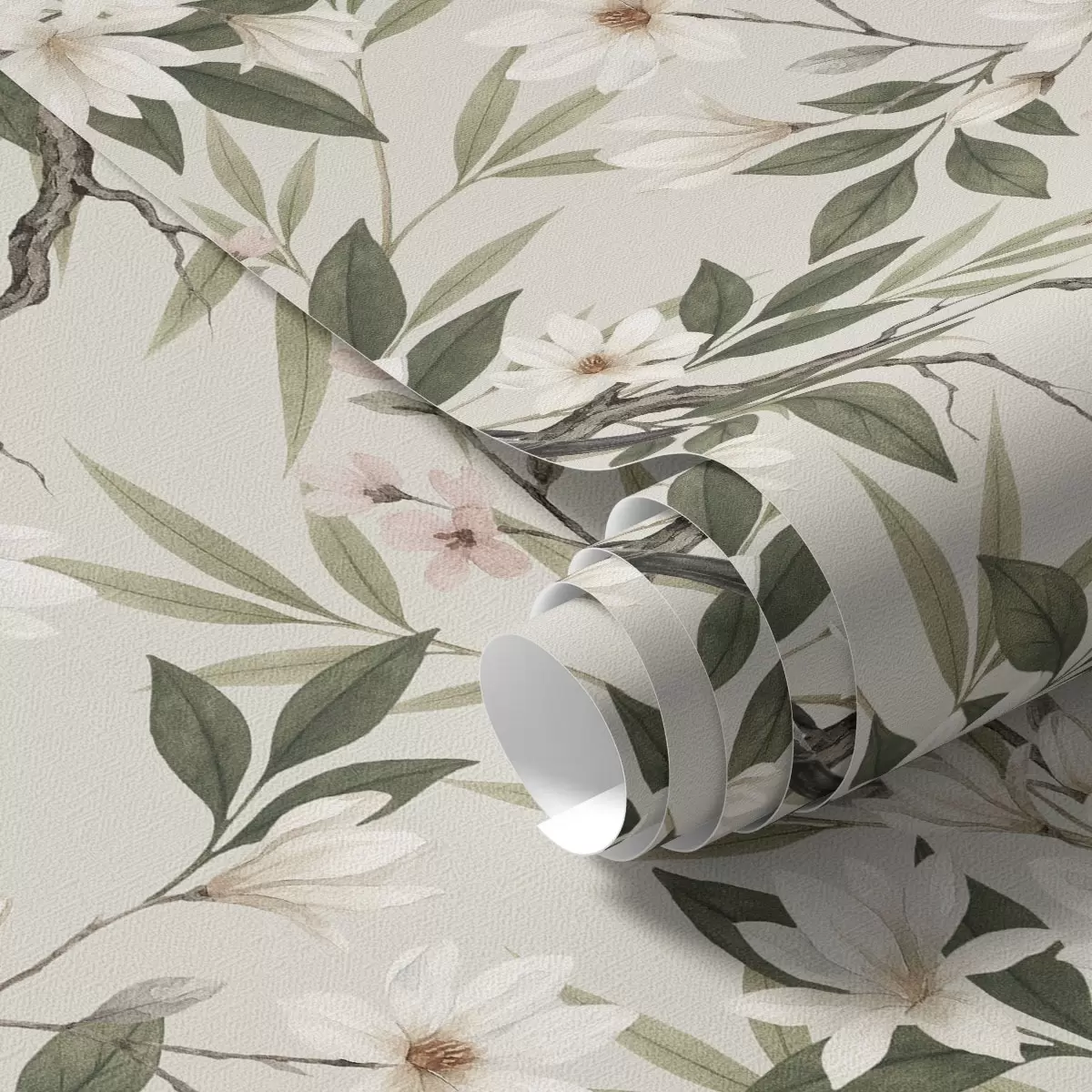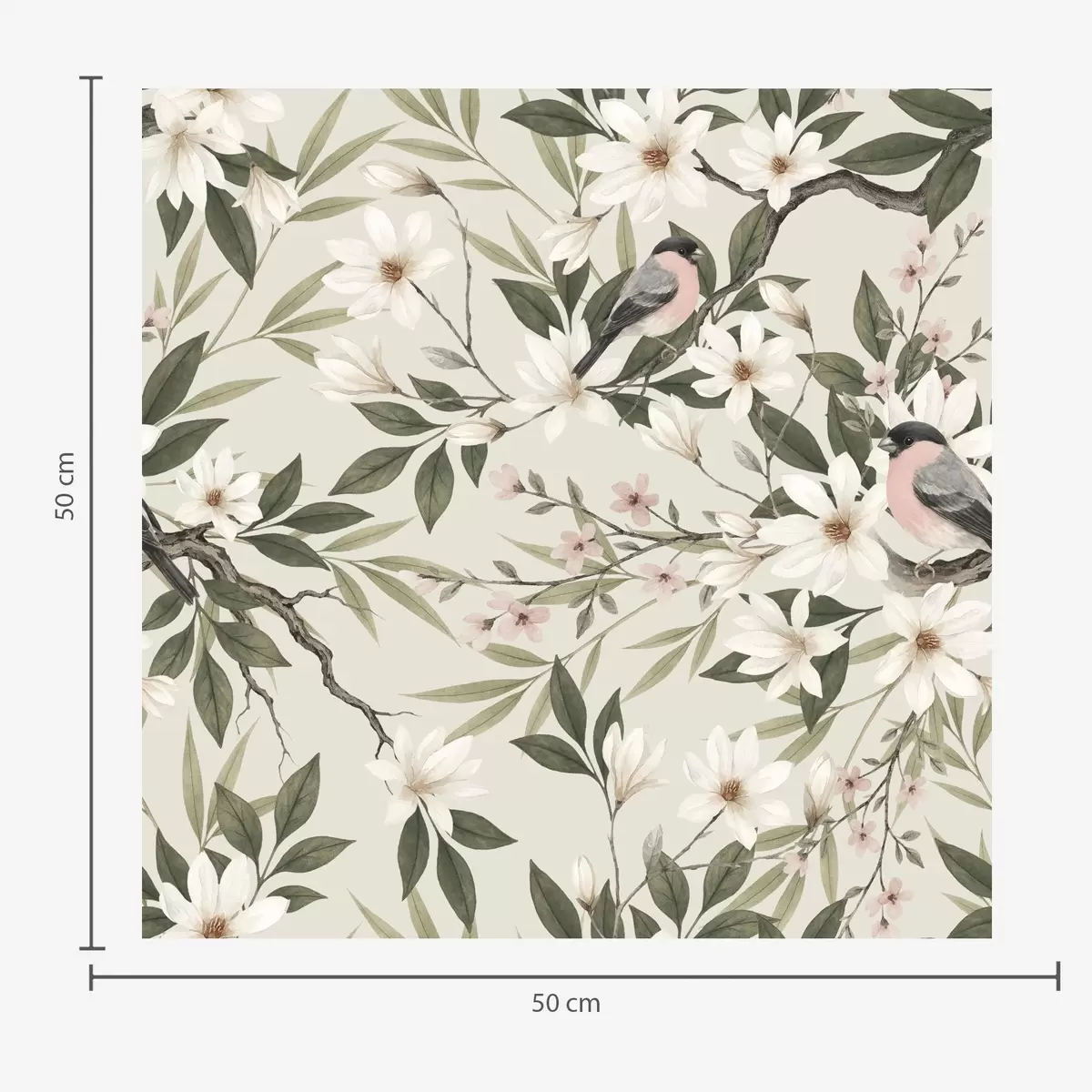 Papel pintado Pintassilgos con el pecho blanco posados en ramas con flores color crema. Nr. a00889