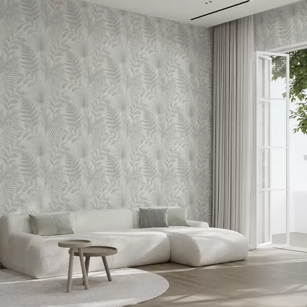 Papel pintado Hojas tropicales suaves en gris pálido sobre textura de lino Nr. a00899