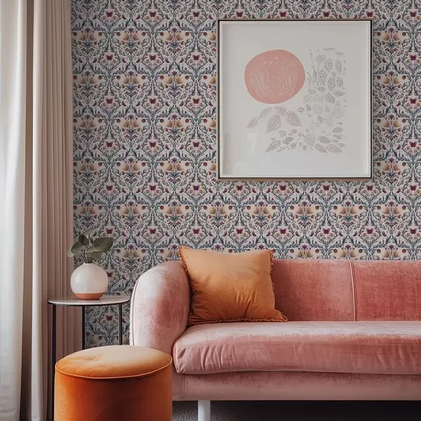 Papel pintado Damasco floral con mariposas sobre fondo melocotón suave Nr. a00926