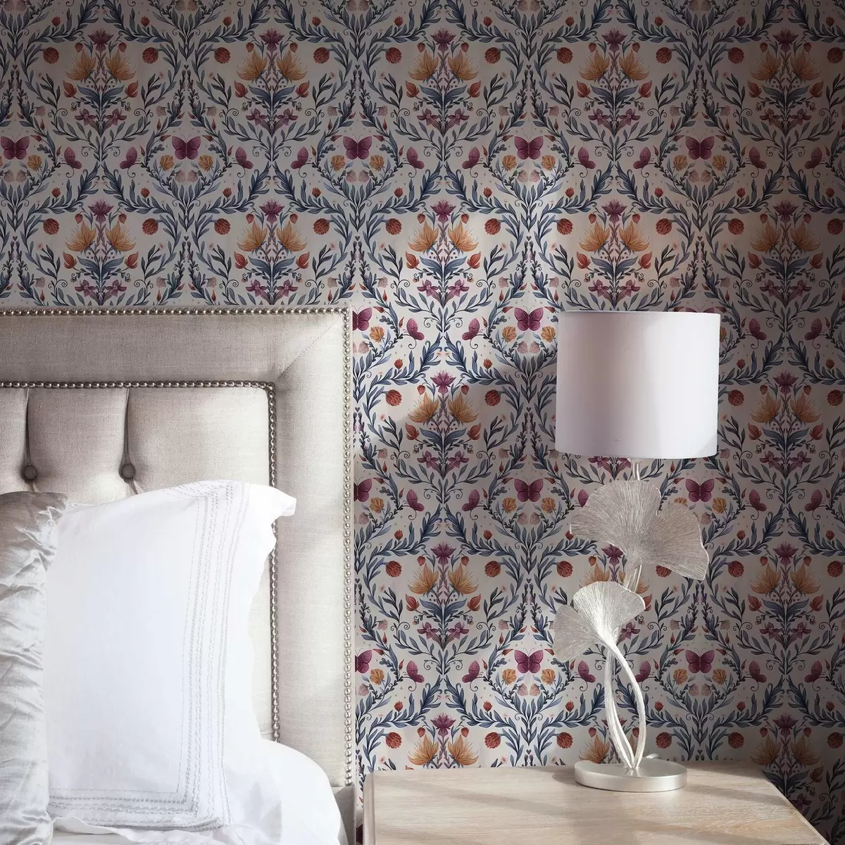 Papel pintado Damasco floral con mariposas en azul marino y terracota sobre fondo blanco Nr. a00926v1