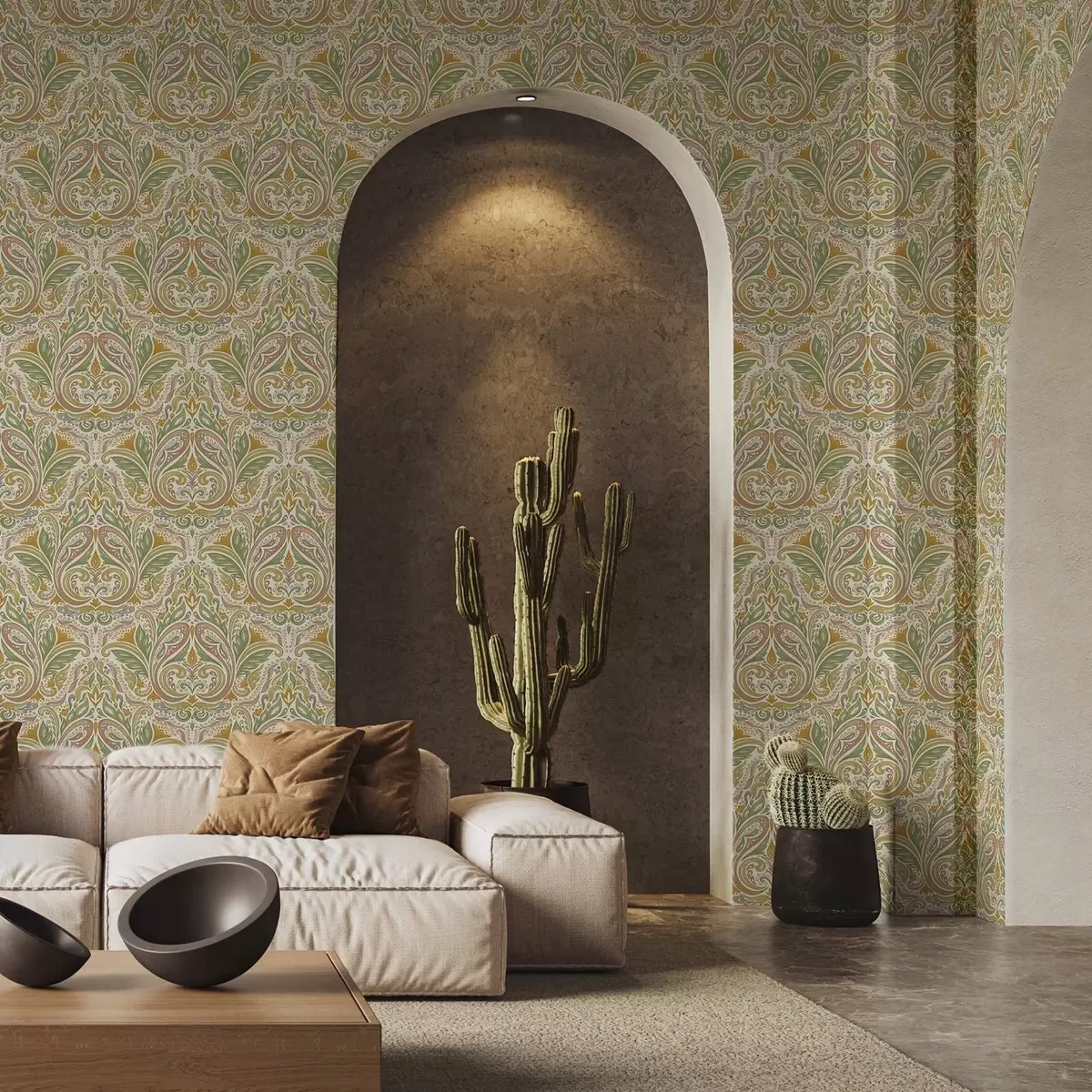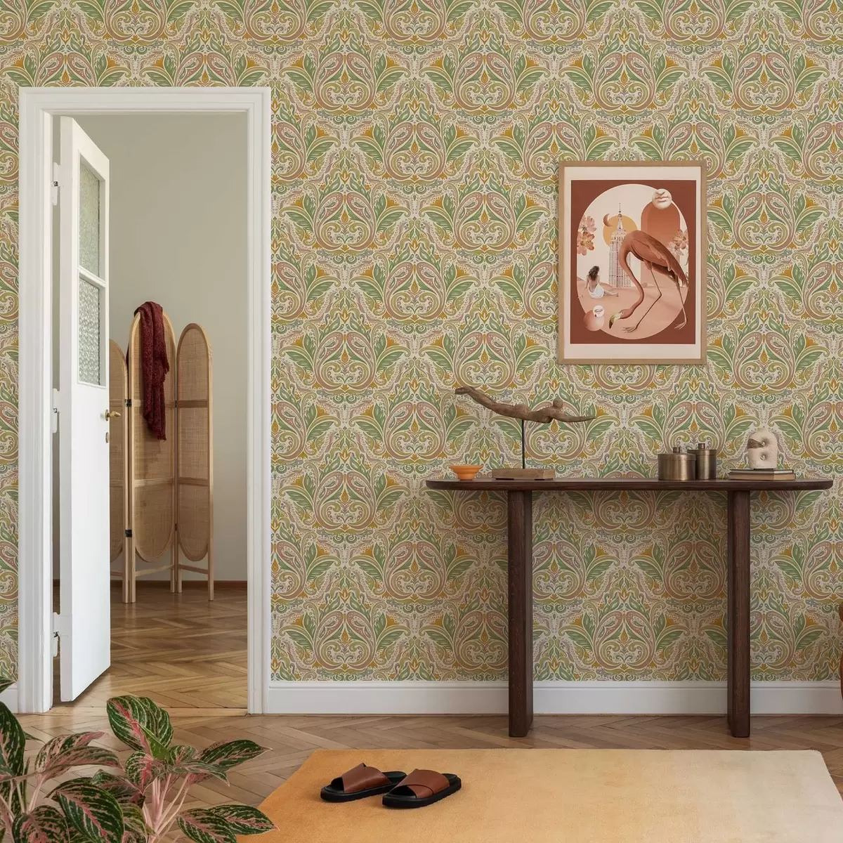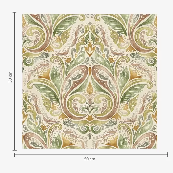 Papel pintado Remolinos ornamentales con hojas en tonos verdes y terracota. Nr. a00927v1