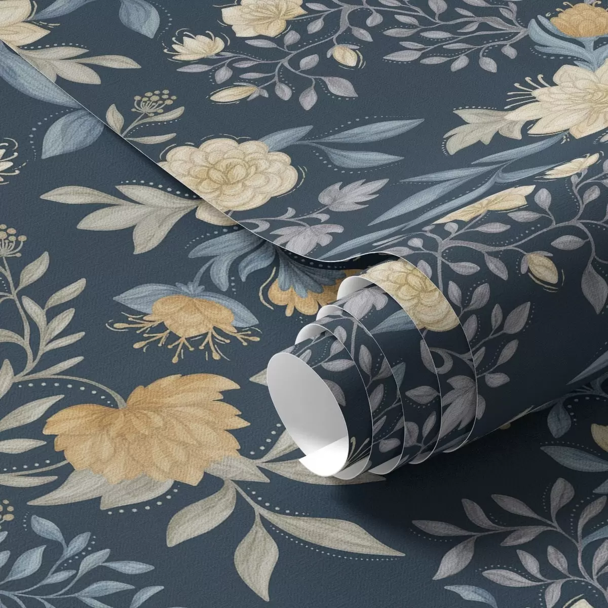 Papel pintado Flores amarillas y azules sobre un fondo azul oscuro vespertino. Nr. a00934v1