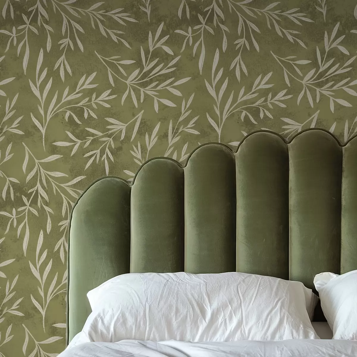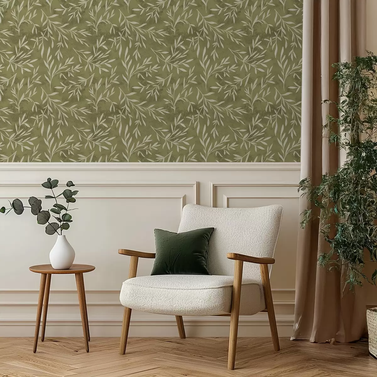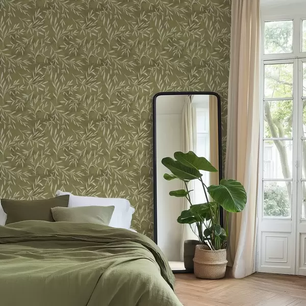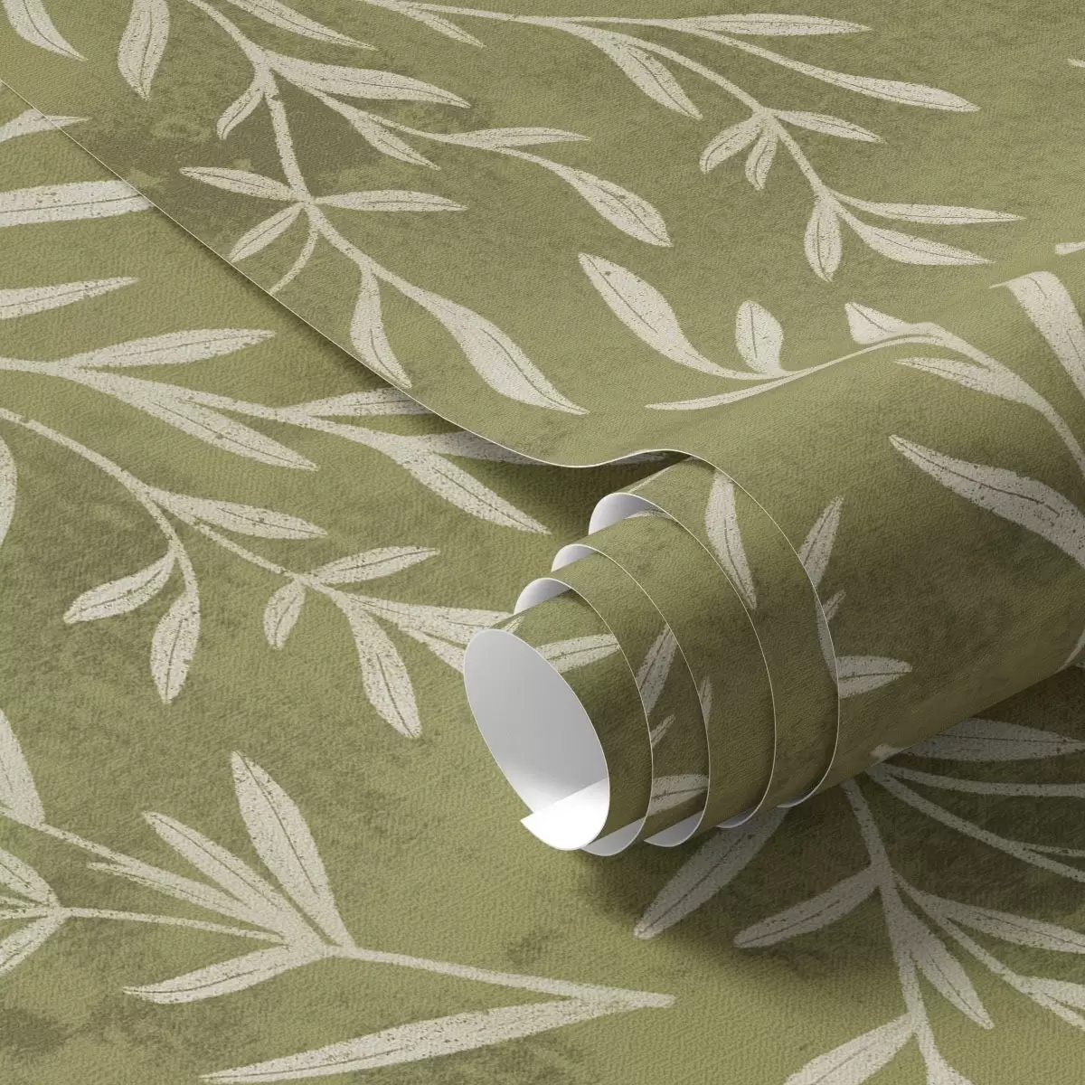 Papel pintado Ramitas de color blanco crema sobre un fondo cálido con textura oliva. Nr. a00936v1