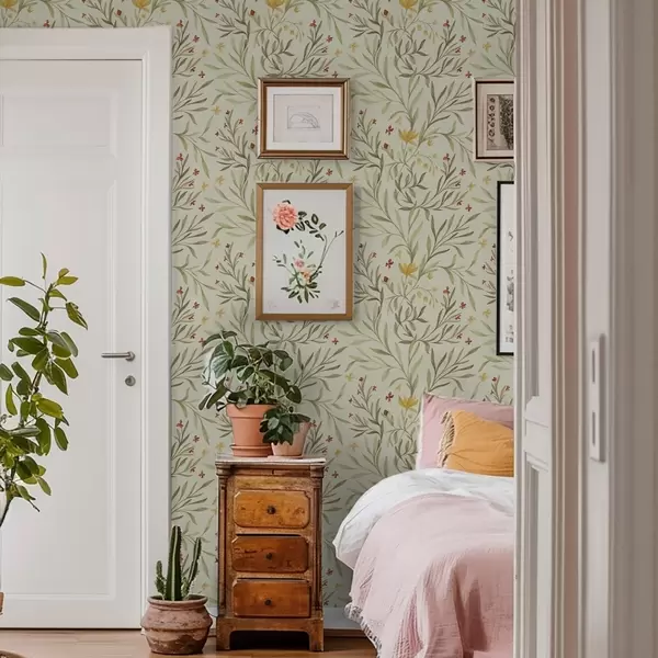 Papel pintado Flores amarillas y rojas sobre un fondo verde claro Nr. a00937
