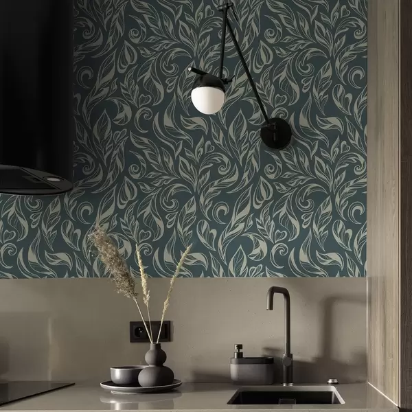 Papel pintado Patrón de hojas con líneas claras sobre fondo azul grisáceo Nr. a00940