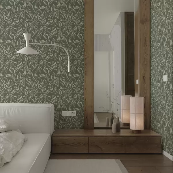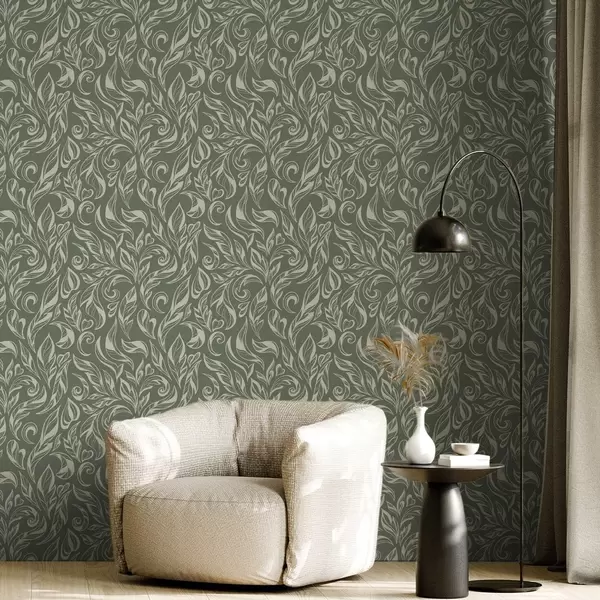Papel pintado Adorno de hojas color crema sobre fondo gris verdoso Nr. a00940v2