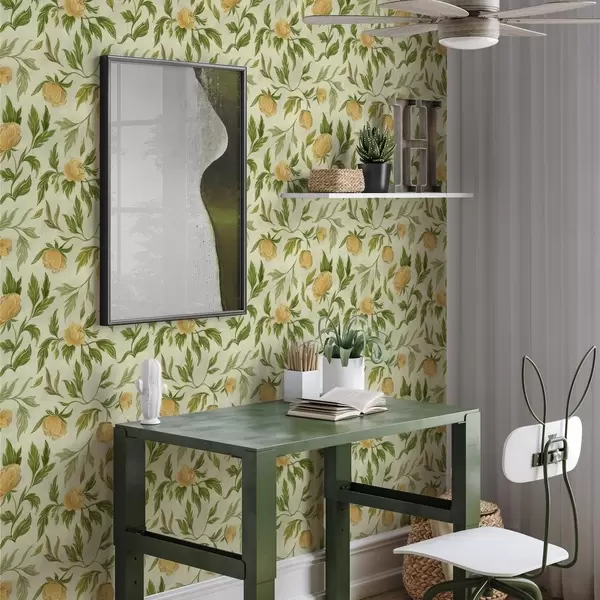 Papel pintado Peonías amarillas y follaje sobre un fondo verde claro suave Nr. a00942