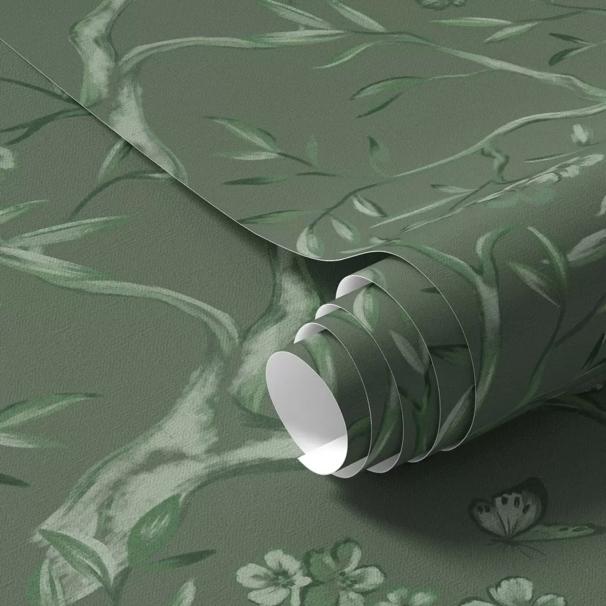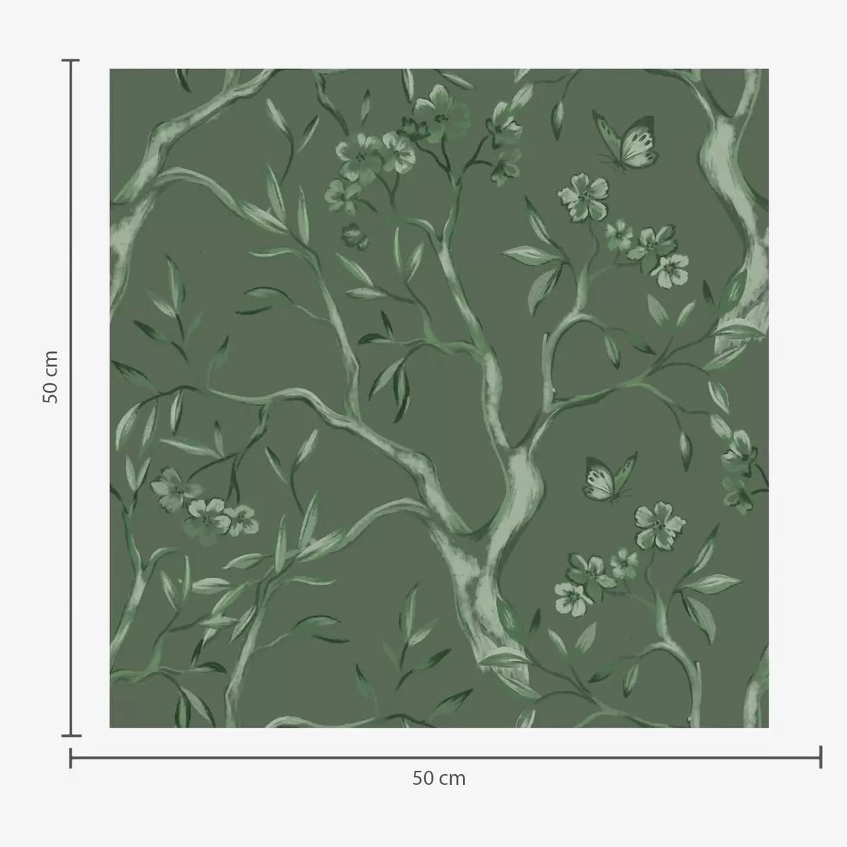 Papel pintado Ramas con flores verdes y mariposas sobre un fondo oscuro. Nr. a00951v3