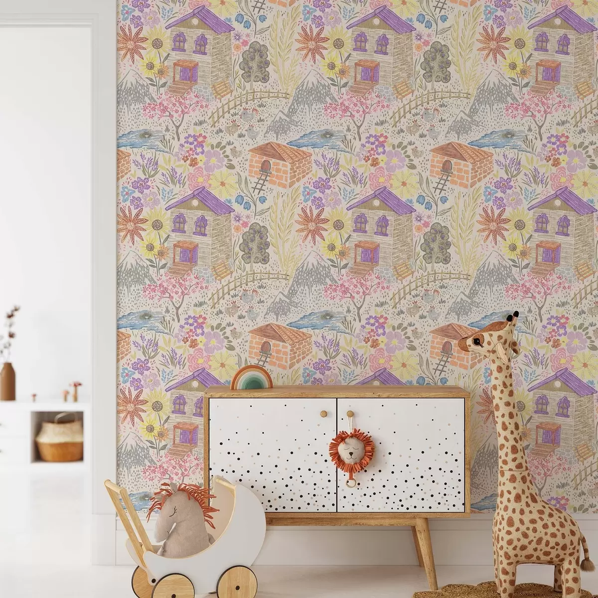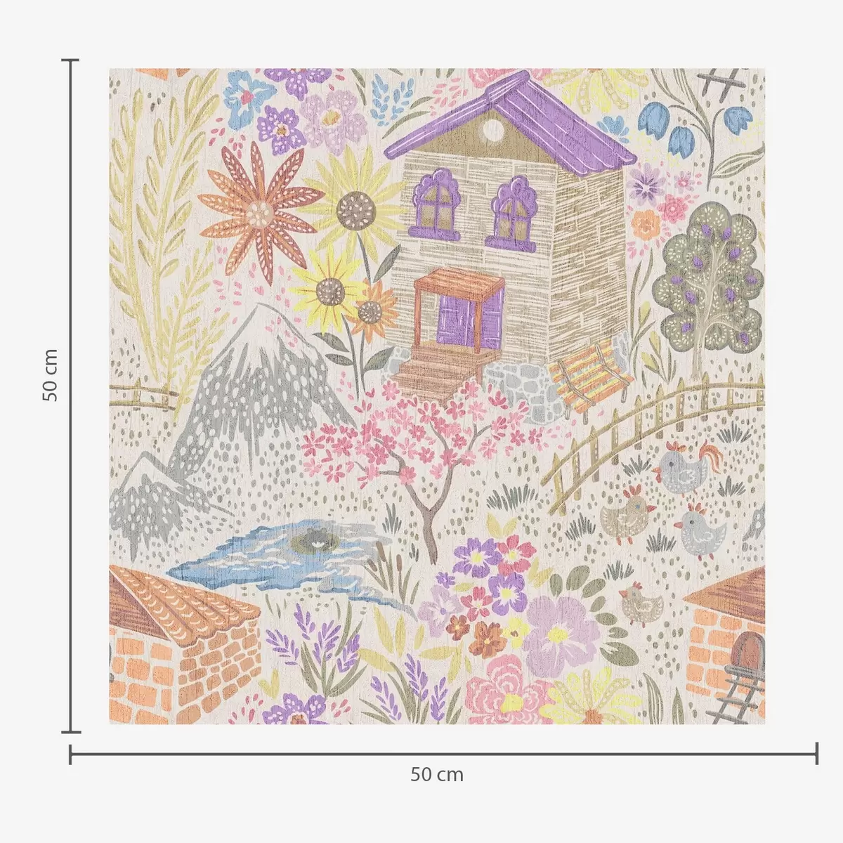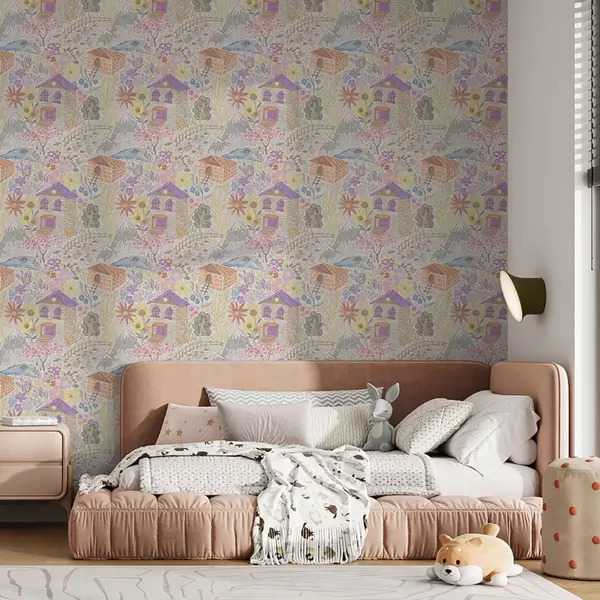 Papel pintado Dibujo infantil de un pueblo con una casa, montañas y flores. Nr. a00952