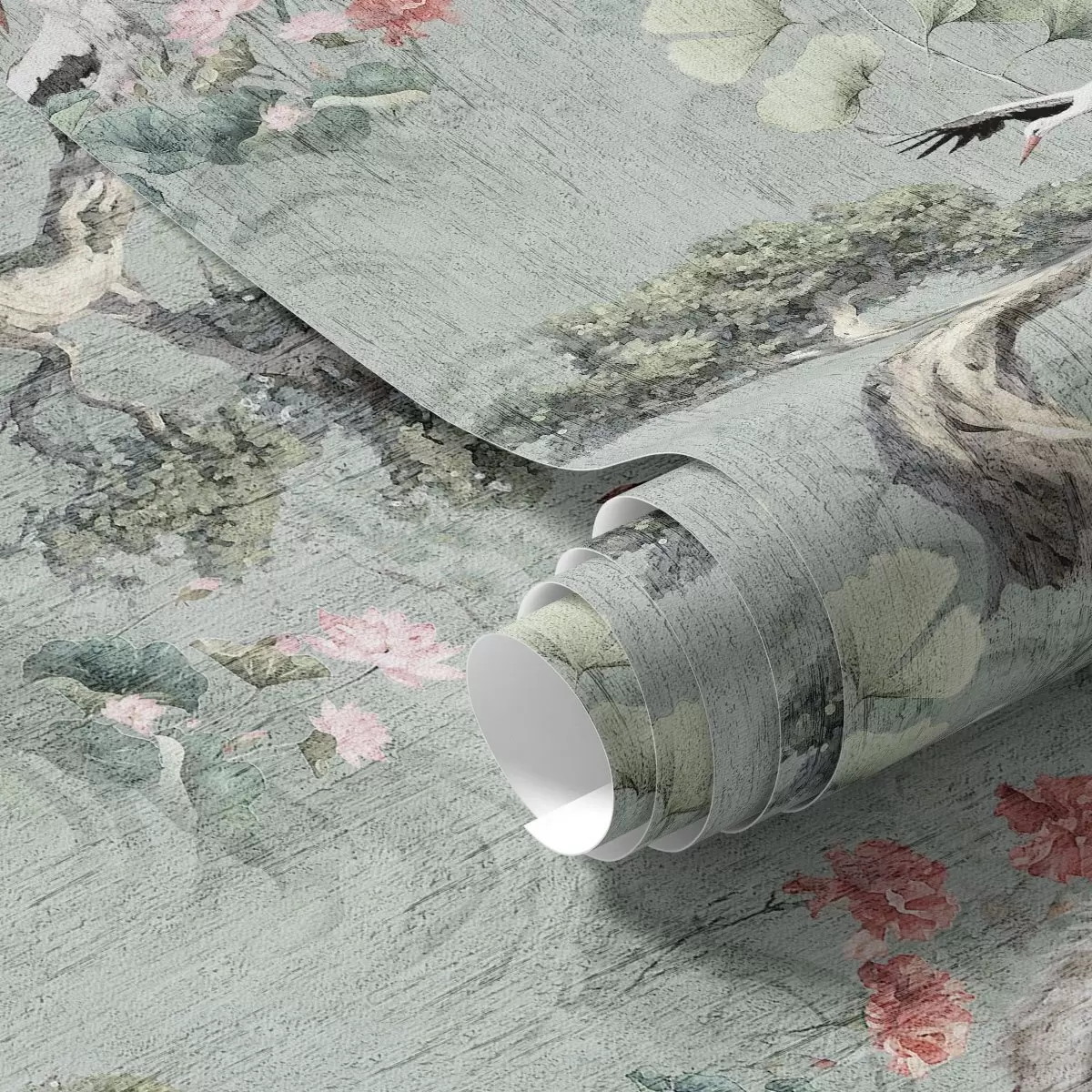Papel pintado Grullas entre pinos y lotos sobre un tranquilo fondo verde. Nr. a00962