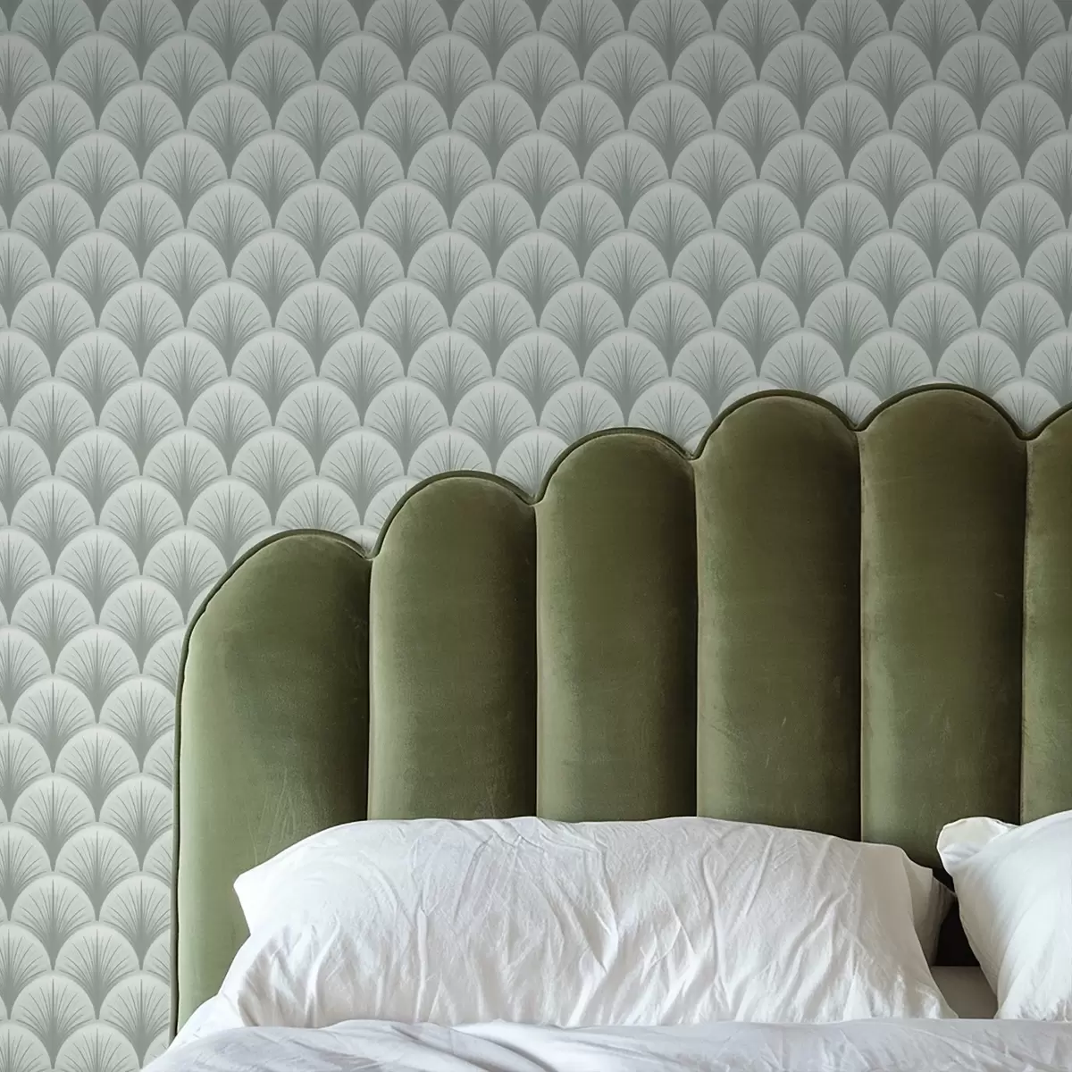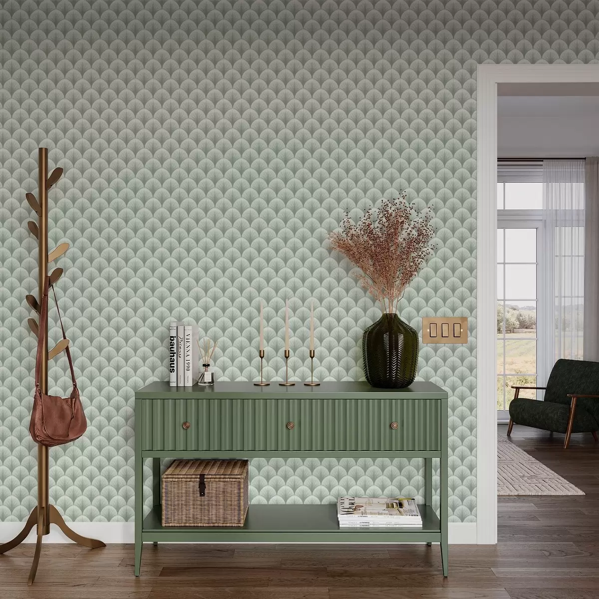 Papel pintado Arcos de hojas de menta con rayos sobre un fondo verde suave Nr. a00978v2