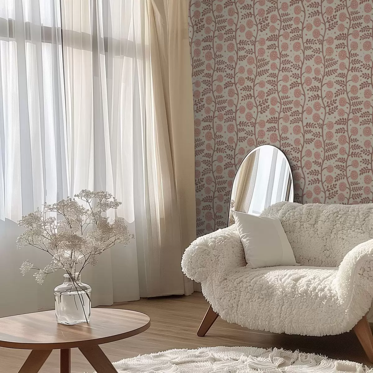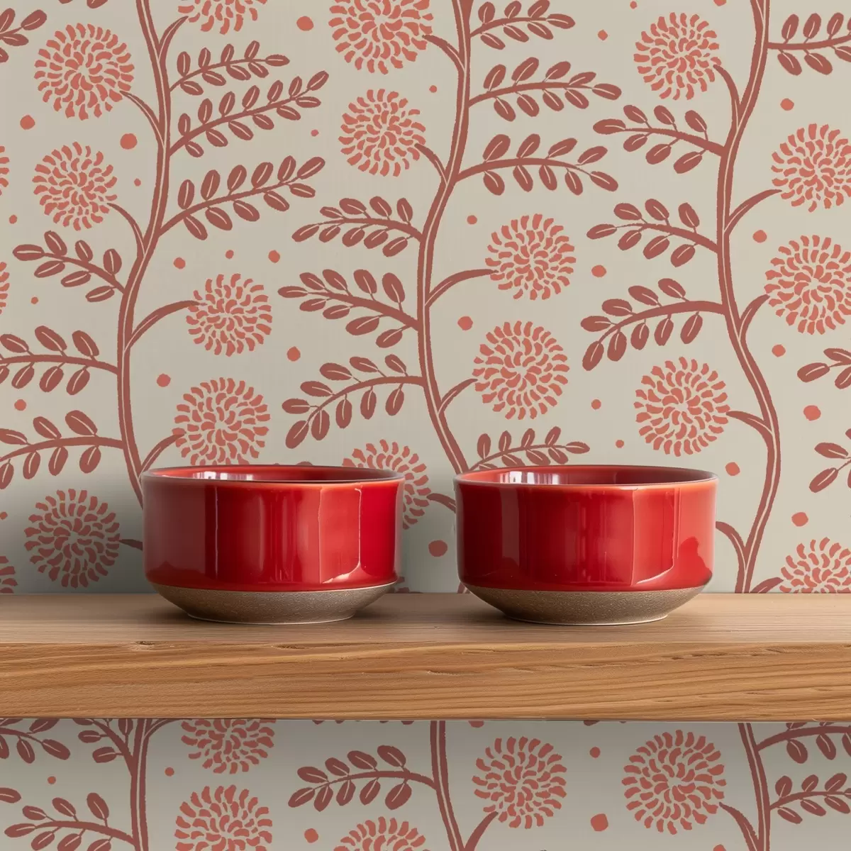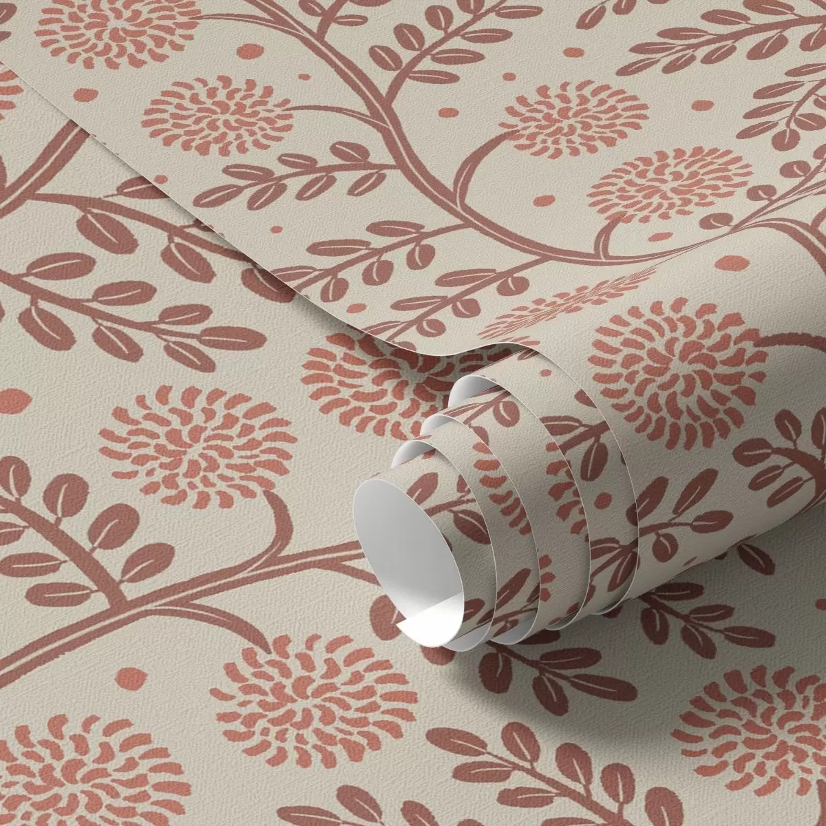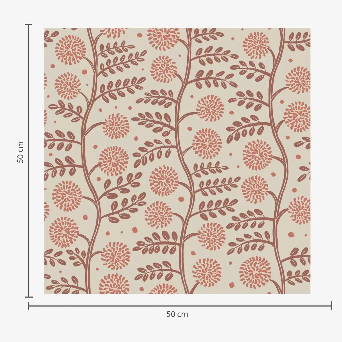 Papel pintado Tallos de terracota con flores coralinas y esponjosas sobre fondo crema Nr. a00997v1